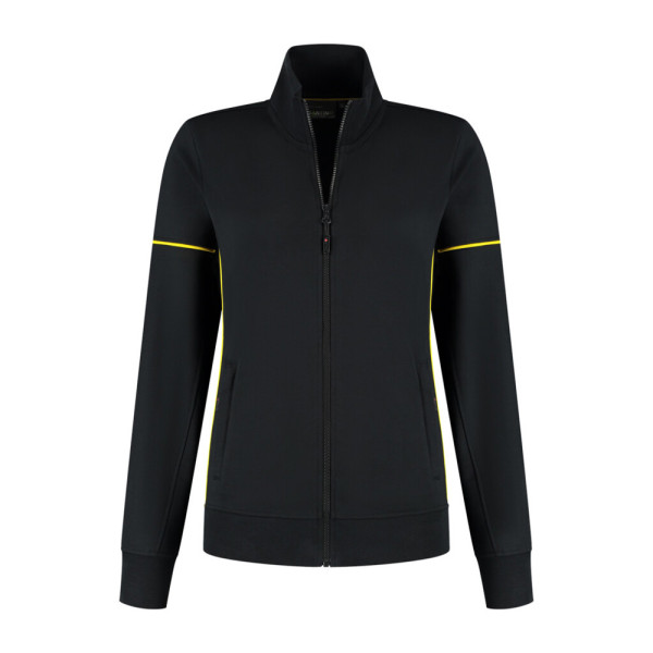 Sweatvest met contrast piping, 50% gerecycled polyester / 48% organisch katoen / 2% elastan (GRS gecertificeerd), 320 gr/m², french terry met geruwde binnenzijde, ladies fit, opstaande kraag, voorsluiting YKK rits met puller, 2 steekzakken met YKK rits en puller, mouw met contrast piping, tailleband en mouw met 1x1 ribboord, 3D logo transfer op onderzijde.