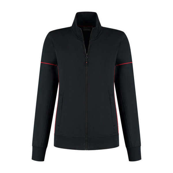 Sweatvest met contrast piping, 50% gerecycled polyester / 48% organisch katoen / 2% elastan (GRS gecertificeerd), 320 gr/m², french terry met geruwde binnenzijde, ladies fit, opstaande kraag, voorsluiting YKK rits met puller, 2 steekzakken met YKK rits en puller, mouw met contrast piping, tailleband en mouw met 1x1 ribboord, 3D logo transfer op onderzijde.