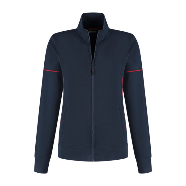 Sweatvest met contrast piping, 50% gerecycled polyester / 48% organisch katoen / 2% elastan (GRS gecertificeerd), 320 gr/m², french terry met geruwde binnenzijde, ladies fit, opstaande kraag, voorsluiting YKK rits met puller, 2 steekzakken met YKK rits en puller, mouw met contrast piping, tailleband en mouw met 1x1 ribboord, 3D logo transfer op onderzijde.