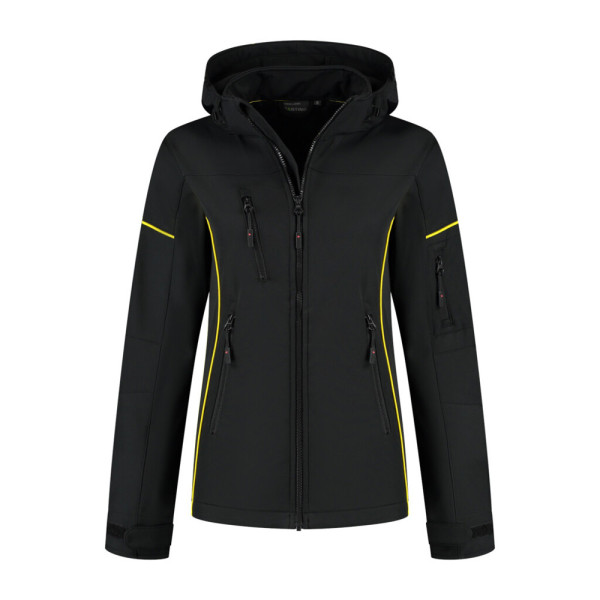 Softshell met contrast piping, 94% gerecycled polyester / 6% elastan (GRS gecertificeerd) , 310 gr/m², 3-laags softshell met microfleece als binnenlaag, stretch ladies fit met opstaande kraag en afritsbare capuchon, voorsluiting met windvanger YKK rits met puller, 2 steekzakken, borstzak en mouwzak met YKK rits en puller, gevoerde mouwen met verstelbare manchetten en windstoppers. Winddicht, ademend, waterafstotend en onderzijde verstelbaar middels koord met stopper, 3D logo transfer op onderzijde.