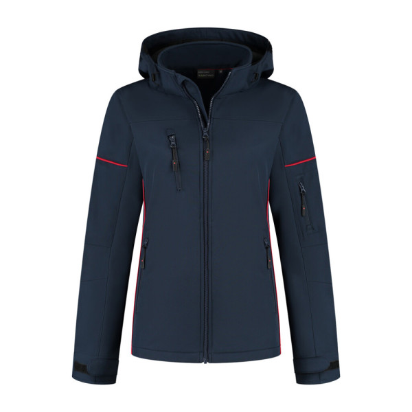 Softshell met contrast piping, 94% gerecycled polyester / 6% elastan (GRS gecertificeerd) , 310 gr/m², 3-laags softshell met microfleece als binnenlaag, stretch ladies fit met opstaande kraag en afritsbare capuchon, voorsluiting met windvanger YKK rits met puller, 2 steekzakken, borstzak en mouwzak met YKK rits en puller, gevoerde mouwen met verstelbare manchetten en windstoppers. Winddicht, ademend, waterafstotend en onderzijde verstelbaar middels koord met stopper, 3D logo transfer op onderzijde.