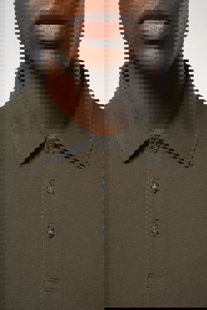 100% gekamd katoen - wasbaar op 60°C (Oxford Grey : 90% katoen / 10% viscose - wasbaar op 40°C). Piqué. Kraag in rib. Nektape en zijsplitjes in Oxford Grey voor alle kleuren behalve Oxford Grey daarvan zijn ze Dark Grey. Knooplijst met 3 knopen. Afwerking met dubbele stiksels aan de onderkant. Mouwuiteinden in rib.
