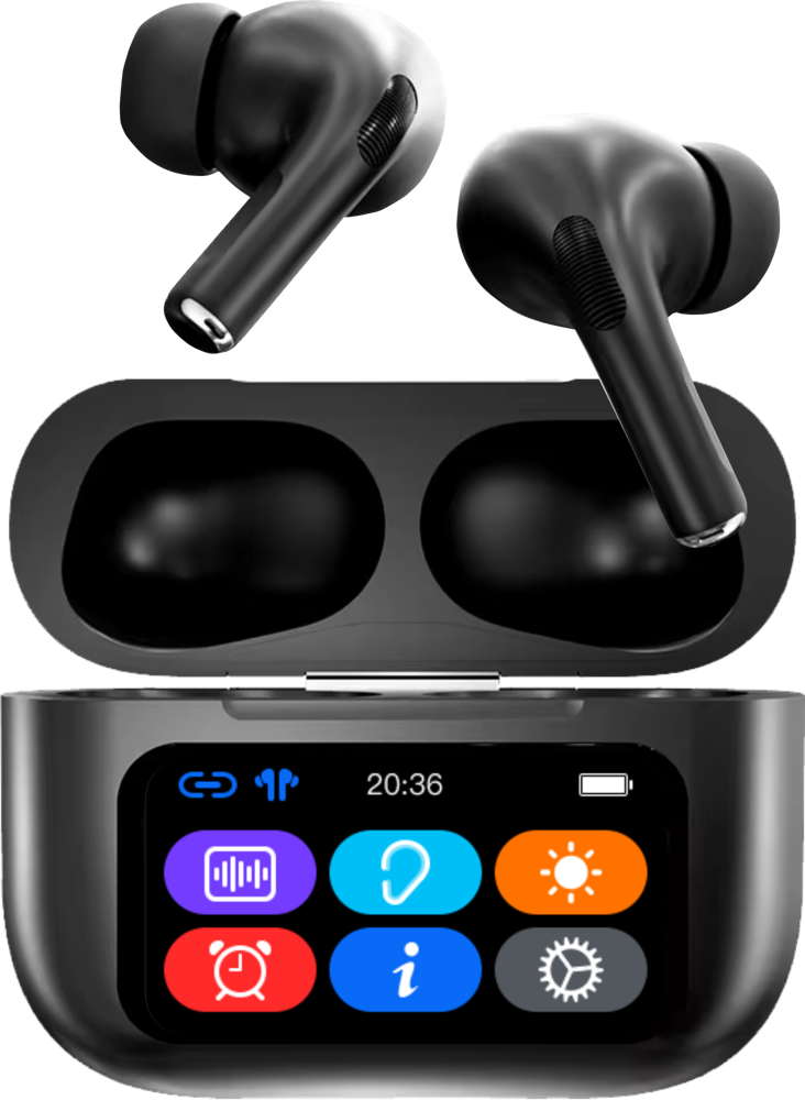 Bedien je muziek en oordopjes moeiteloos via het ingebouwde scherm op de oplaadcase.