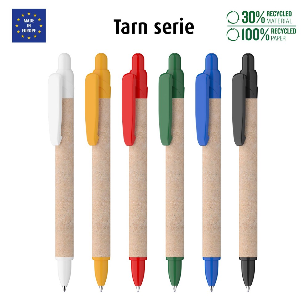 Balpen van 100% gerecycled karton en 30% gerecycled ABS. X-20 vulling voor 2500 meter schrijven. Rondom zeefdruk in meer kleuren mogelijk en/of 1 of meer kleuren tampondruk op de clip.