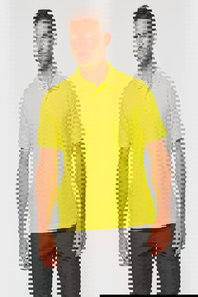 60% katoen / 40% gerecycled polyester. Gekamd katoen. Interlock piqué. Regular fit. Industrieel en/of huishoudelijk wasbaar op 60°C. Tunnel drogen. Kraag en mouwboorden van 1x1 rib. Nektape aan de binnenkant. Kraagsluiting met 2 verborgen drukknoopjes onder de sluiting. Verstevigingen aan de binnenkant van de schouders in keperstof (65% polyester / 35% katoen) om vervorming bij industriële wasbeurten en tunneldrogen te voorkomen. RFID-zakje aan de onderkant van het kledingstuk onder het label. Dubbele stiksels aan de onderkant van het kledingstuk. PBM Klasse II - Normen NF EN ISO 13688:2013 + NF EN ISO 13688/A1:2021 (Beschermende kleding - Algemene eisen), NF EN 17353:2020: Type A (Beschermende kleding - Uitrusting voor verbeterde zichtbaarheid in situaties met matig risico - Testmethoden en eisen), NF EN ISO 15797:2018 (Textiel - Industriële was- en afwerkingsmethoden voor het testen van werkkleding): Professioneel industrieel wassen - Wasmethode programma 8 met alleen tunnelafwerking. Geweven merketiket.