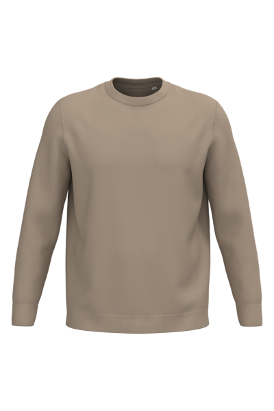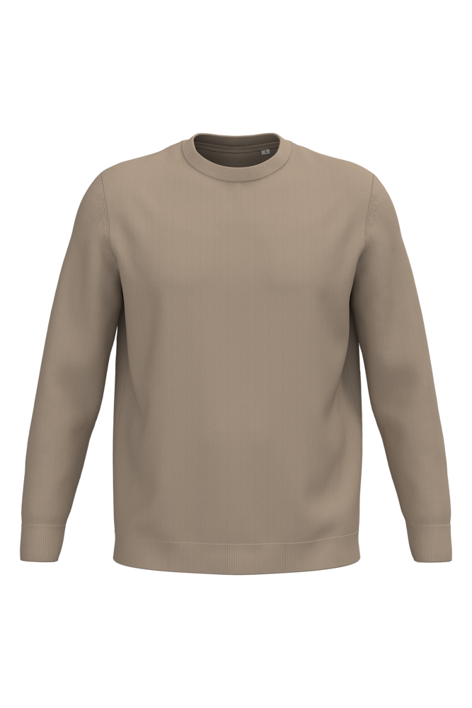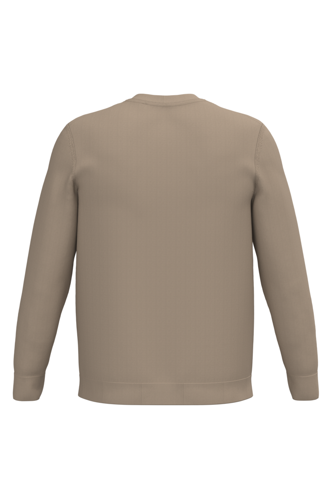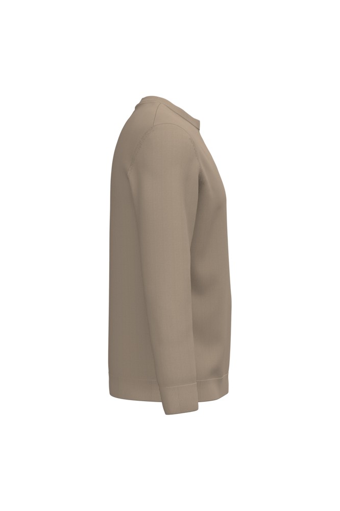 100% biologisch katoen. Gekamd katoen. Gauge 12. Rechte snit. 1x1 ribboord aan kraag, zoom en mouwuiteinden. 'Fully Fashion' gebreid. Behandeld tegen pluizen. De hals is aan de binnenkant afgewerkt met ton-sur-ton nektape in de hoofdstof. Gemiddeld gewicht in maat L: 270 g.