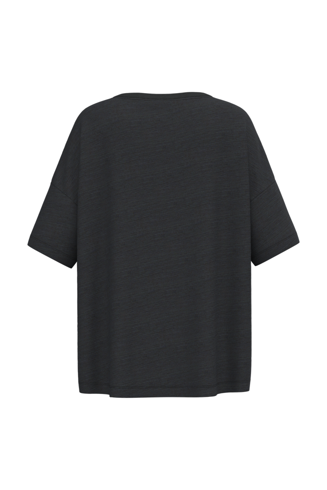 100% biologisch katoen. Gekamd katoen. Jerseytricot met gevlamd effect. Oversized pasvorm met afhangende schouders. Enzymgewassen. Zijnaden. Ronde hals met 1x1 ribboord. Schouderversteviging. De hals is aan de binnenkant afgewerkt met ton-sur-ton nektape in de hoofdstof. Afgewerkt met dubbel stiksel aan mouwuiteinden en onderkant.