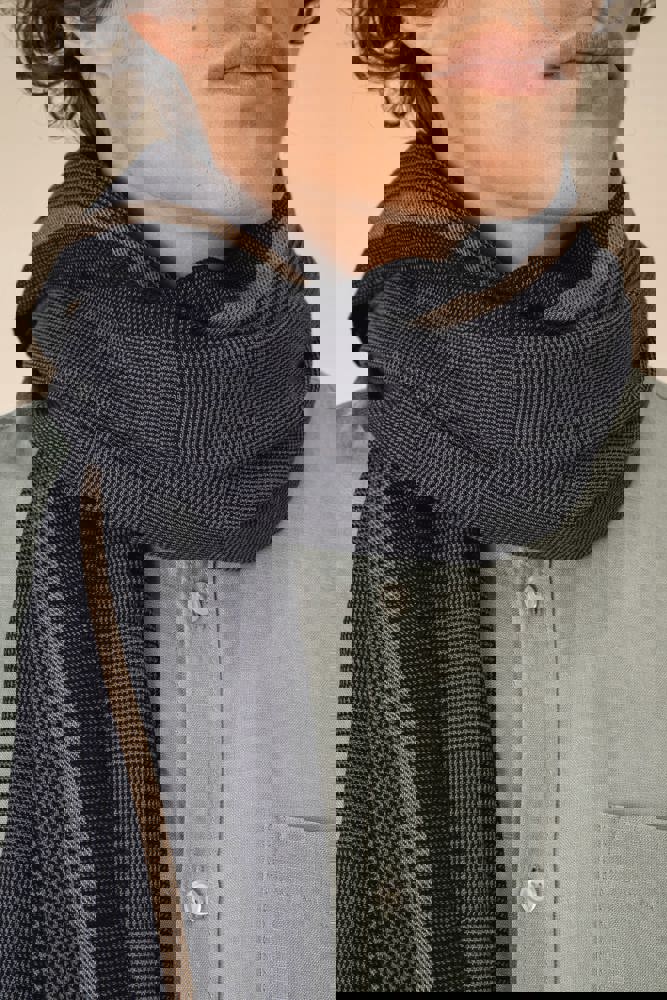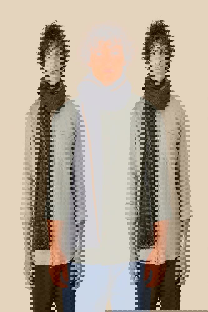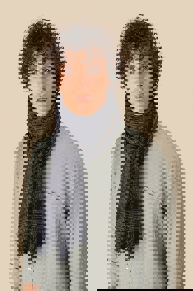 50% katoen, 50% viscose. Geweven tulbanddoek met franjes. Geweven ruitjes in schakeringen van grijs en zwart, geaccentueerd met een subtiel beige biesje. Onze tulbanddoeken zijn ambachtelijk geweven en kunnen daarom kleine kleurverschillen vertonen, wat een teken is van authentiek vakmanschap.