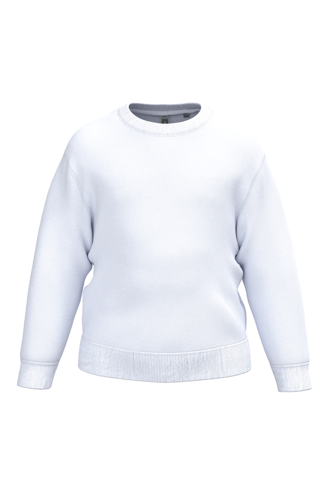 50% ringgesponnen katoen / 50% post-consumer gerecycled polyester. Geborsteld fleece aan de binnenkant. Straight snit. Cut-and-sew. Enzymgewassen. 2x1 ribboord in buisconstructie voor een betere afwerking aan hals, mouwuiteinden en onderkant. Dubbel stiksel aan schouders, mouwinzet, mouwuiteinden en onderaan. Ton-sur-ton nektape van jersey in de hals. Geen merklabel, maar een maatlabel in de kraag voor eenvoudige personalisatie.