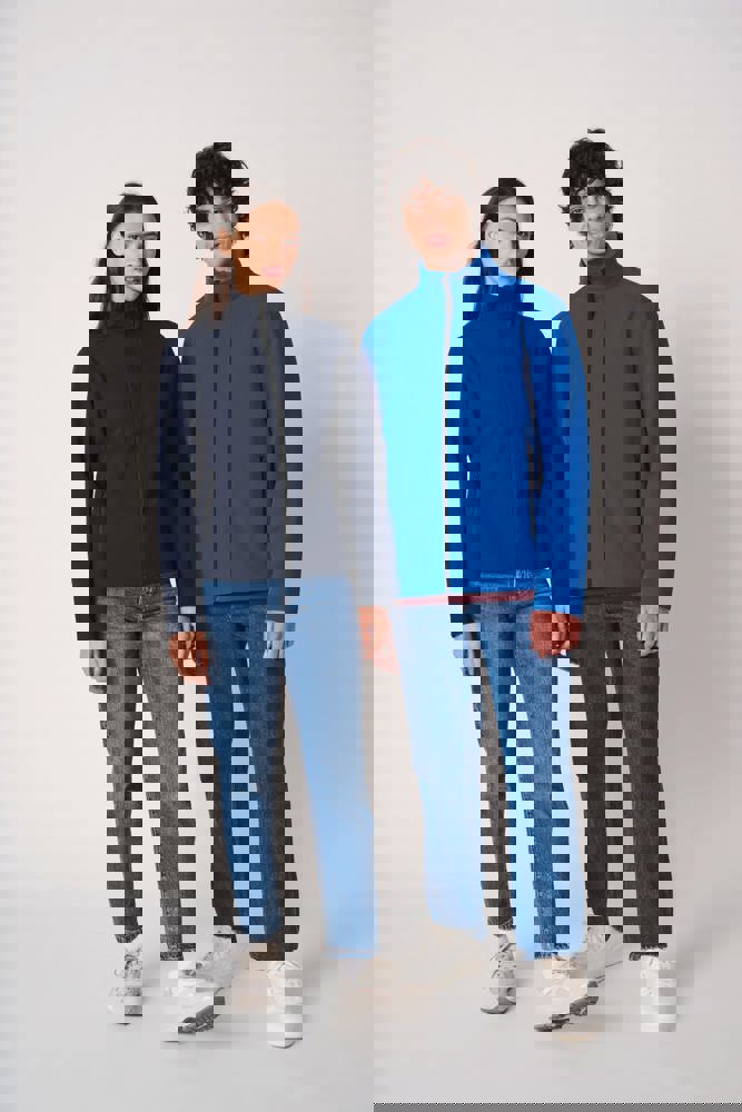 95% polyester / 5% elastaan. Softshell 2 lagen met waterafstotende behandeling. Binnenkant: zwarte micropolar van 100% polyester. Rechte snit. Twee zijzakken met polytricot voering, nylonritsen en zwarte ritstrekkers. Ritssluiting in zwart nylon met kinbescherming en ritstrekker. Schouder- en rugstukken met sierstiksels. Zwarte nektape aan de binnenzijde. Mouwboorden en zoom afgewerkt met dubbele stiksels. Afneembaar merklabel.