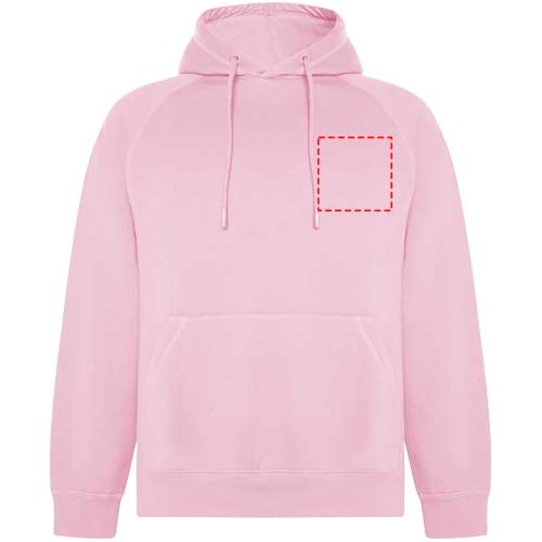 Unisex hoodie van biologisch katoen en gerecycled polyester. Kangoeroezak. Enkele jersey voering in capuchon. Rond verstelbaar trekkoord en geborduurde oogjes. Manchetten en tailleband van 2x1 geribde stof. Verwijderbaar etiket. Individuele gerecyclede verpakking. Het mannelijke model is 185 cm en draagt maat L en het vrouwelijke model is 168 cm en draagt maat S.