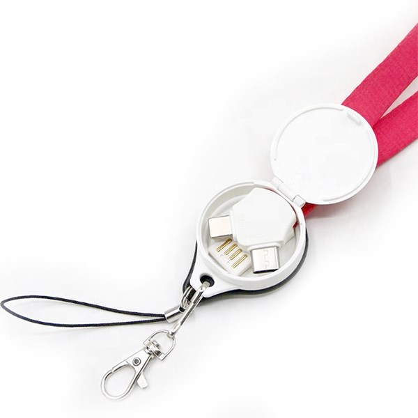 Draag de nylon oplaadlanyard met je entreekaart, sleutels, visitekaartje of maak de buckle los voor het opladen van je telefoon of tablet. De kabel heeft een standaard usb aansluiting en 3 connectoren voor zowel Micro USB als Lightning en android . De lanyard kan full colour bedrukt worden aan beide zijden of op de button