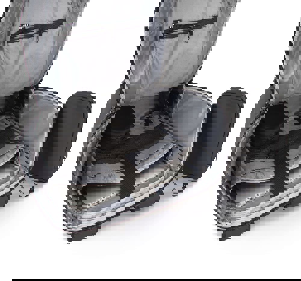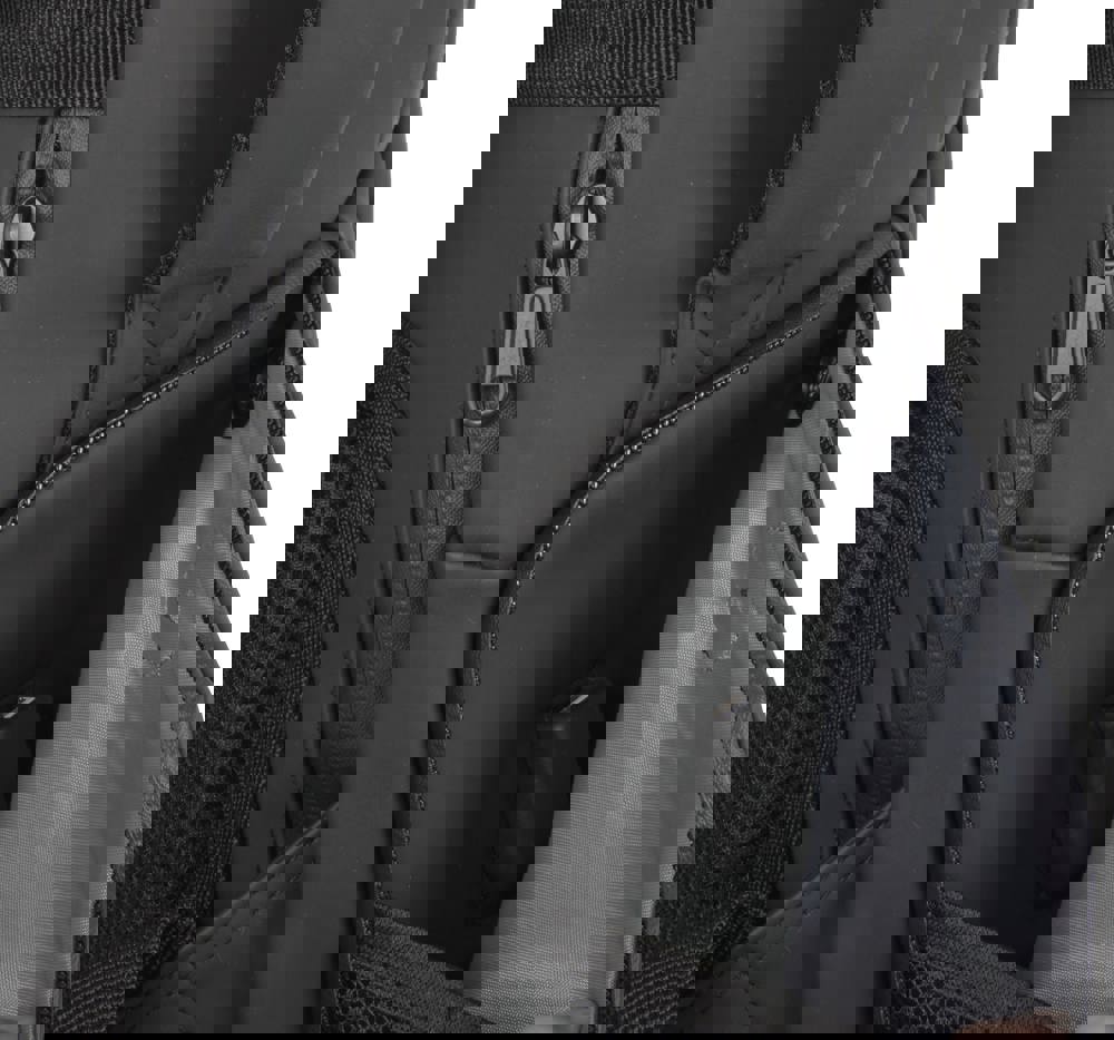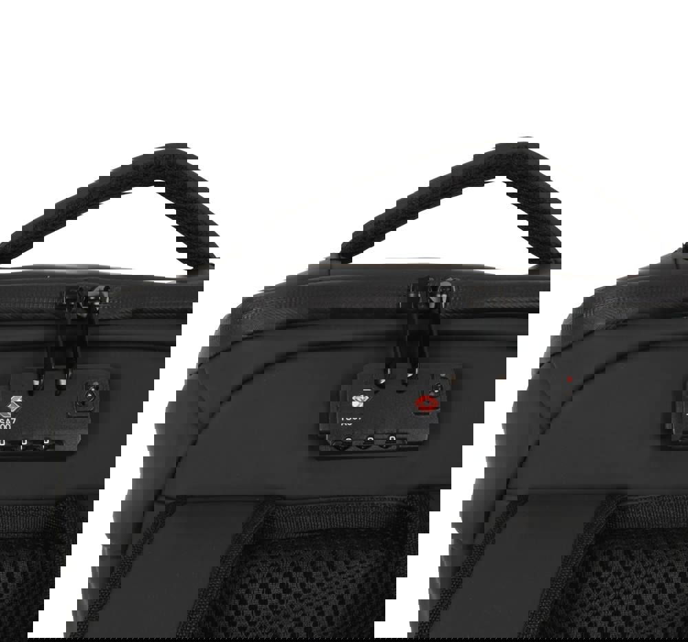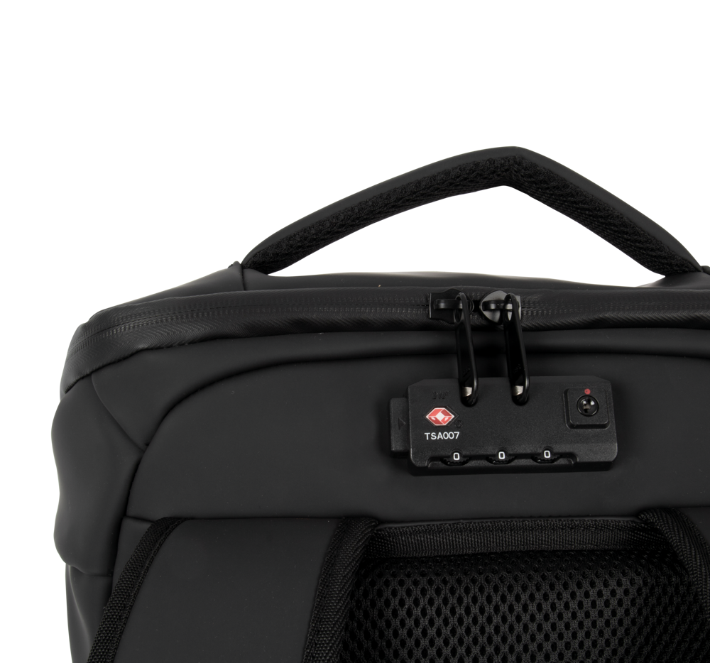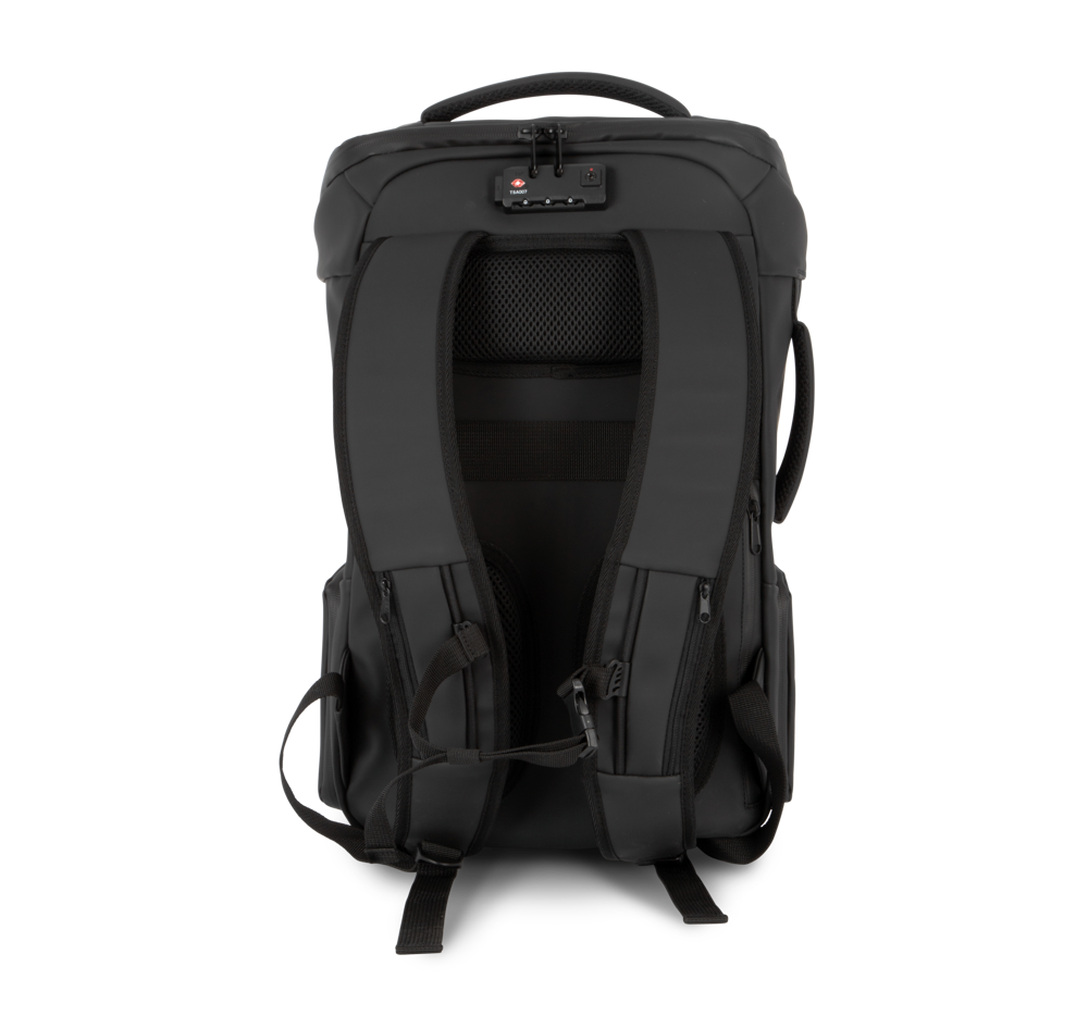100% polyurethaan. Waterdichte anti-diefstaltas Afneembare helmhouder van elastische mesh. TSA-cijferslot, een zijzak met een anti-diefstalkabeltje en een binnenzak met een RFID-bescherming. Gemakkelijk toegankelijke ritszak op de rug, twee ritszakken op de schouderbanden, twee bevestigingsriemen onder de tas , twee zijzakken, een opbergzijzak met USB-poort en een micro-USB-poort (kabel inbegrepen). Het binnenste compartiment heeft een vak voor een computer van max. 15'' en een gewatteerd vak voor een tablet tot 11''. Binnenin twee ritszakken van mesh en twee binnenzakken, waarvan één voor een drinkbus en één voor een powerbank. Deze tas heeft ook twee uitneembare ritstasjes voor kabeltjes en accessoires. De comfortabele tas heeft gewatteerde verstevigingen op de achterzijde, gewatteerde, aanpasbare schouderbanden en een regelbare borstriem om de tas gemakkelijker te kunnen dragen.