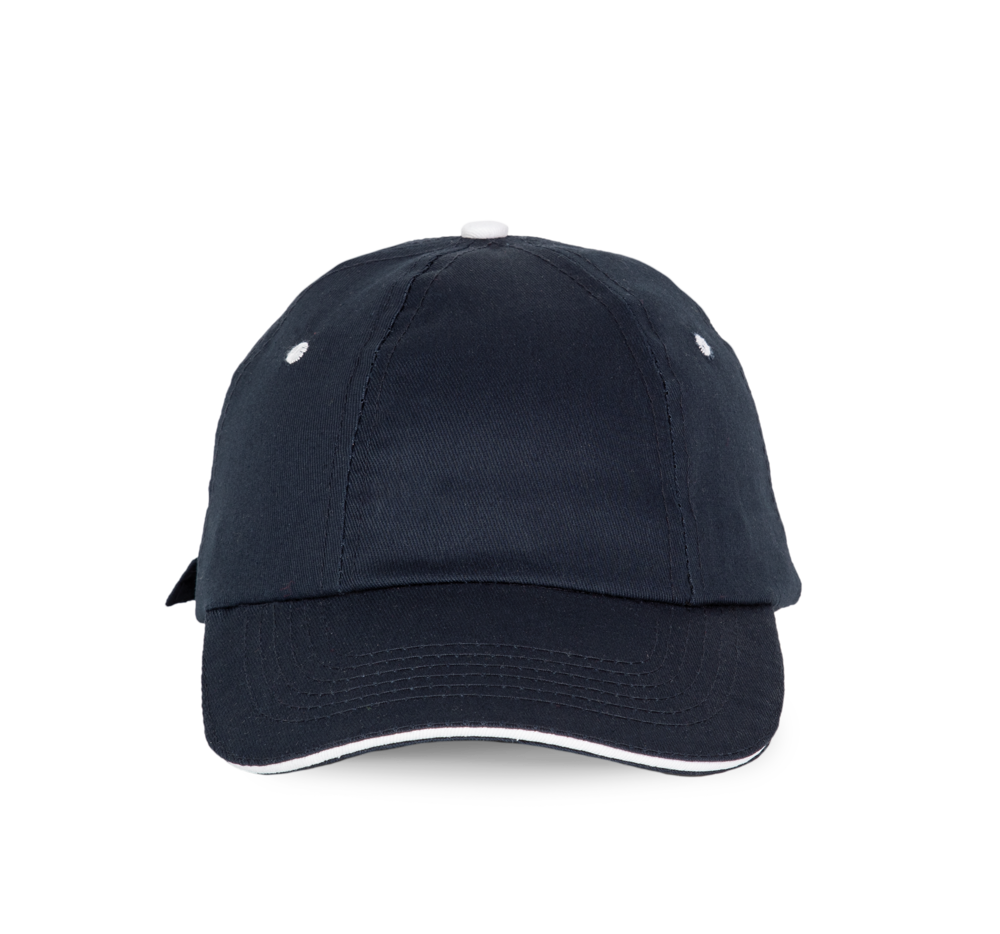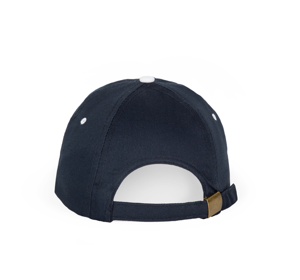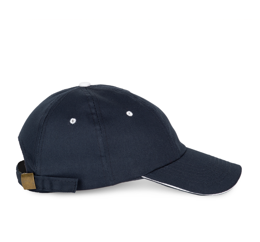 100% katoen twill. Eén segement aan de voorkant om de personalisatie te vereenvoudigen. Klep met contrasterende bies. Verstelbare sluiting met een metalen gesp.