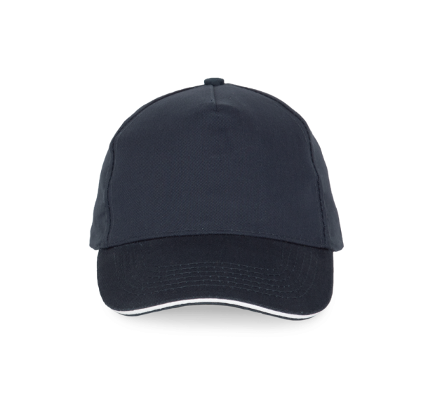 100% zwaar geborsteld sergé katoen. 5 panelen. Klep met contstrasterende bies. Katoenen zweetband. Verstelbare gesp-sluiting.