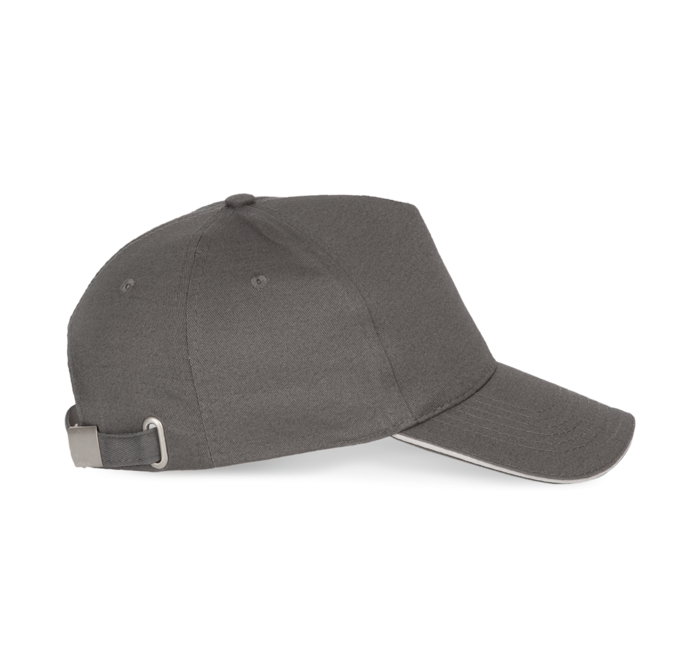 100% zwaar geborsteld sergé katoen. 5 panelen. Klep met contstrasterende bies. Katoenen zweetband. Verstelbare gesp-sluiting.