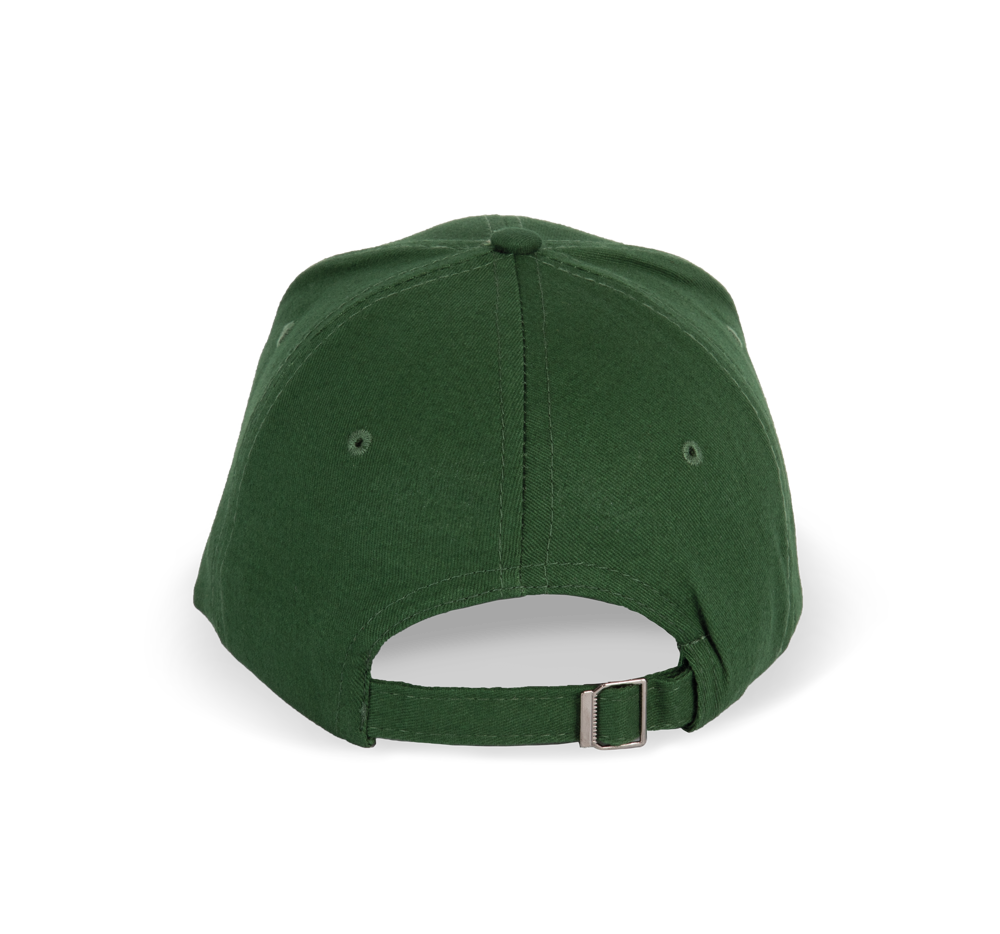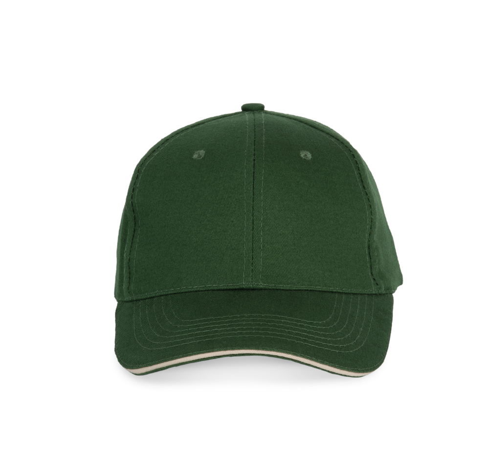 100% twillkatoen. 6 panelen. Contrasterende bies. Verstelbare sluiting aan de achterkant met metalen gesp.