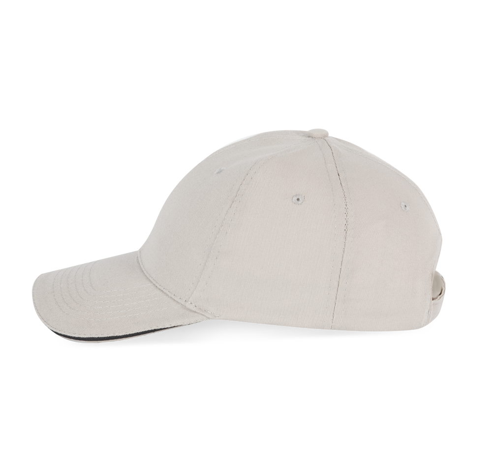 100% twillkatoen. 6 panelen. Contrasterende bies. Verstelbare sluiting aan de achterkant met metalen gesp.