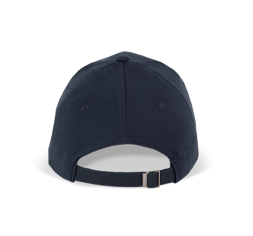 100% twillkatoen. 6 panelen. Contrasterende bies. Verstelbare sluiting aan de achterkant met metalen gesp.