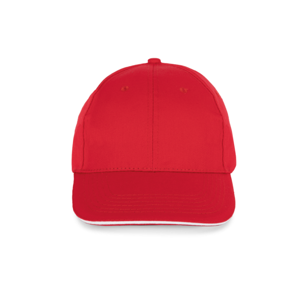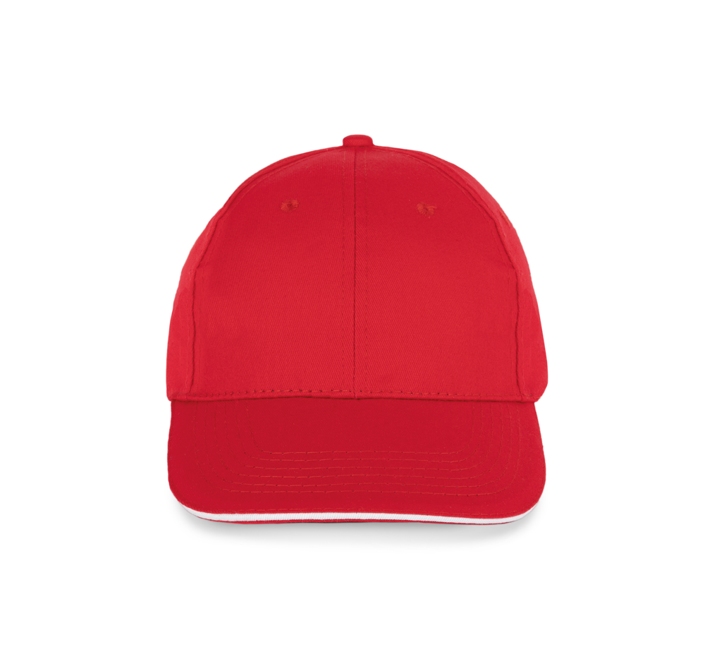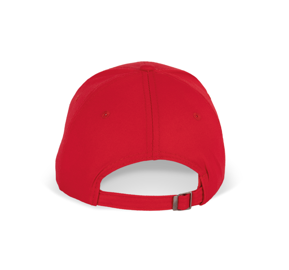 100% twillkatoen. 6 panelen. Contrasterende bies. Verstelbare sluiting aan de achterkant met metalen gesp.