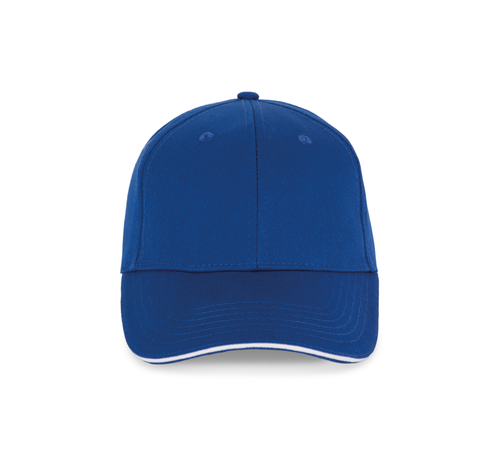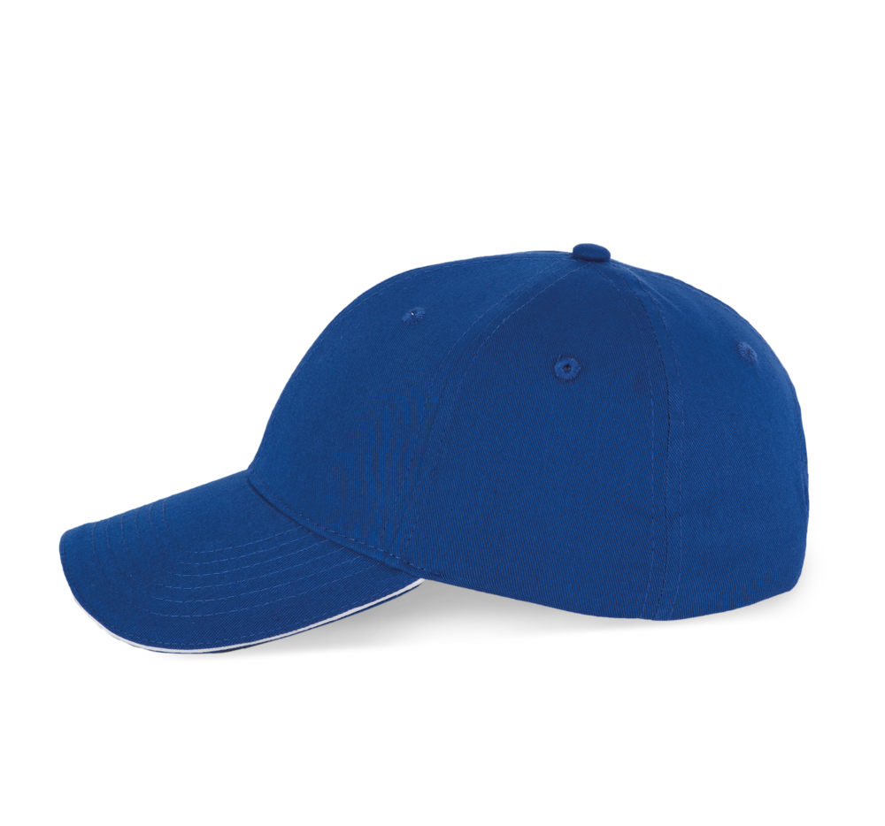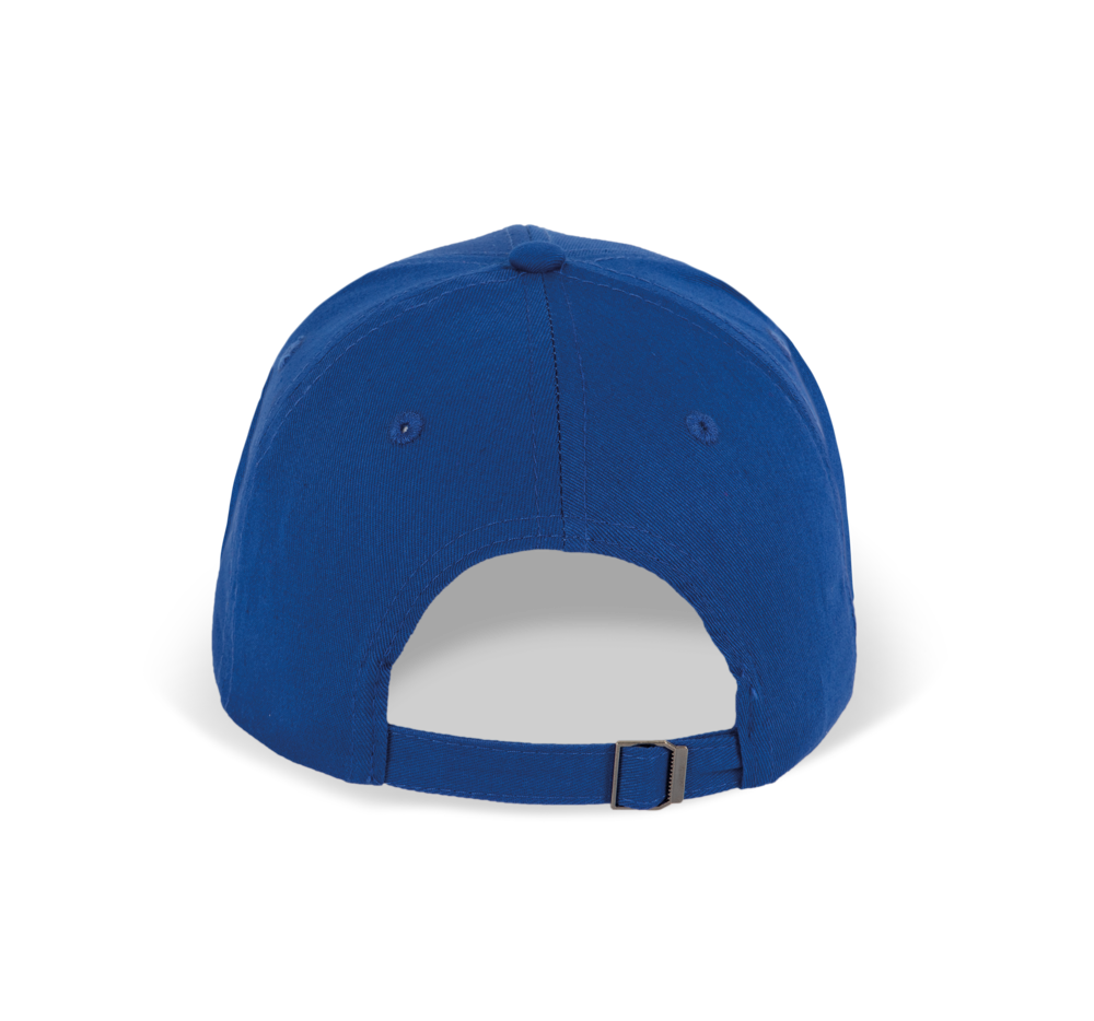 100% twillkatoen. 6 panelen. Contrasterende bies. Verstelbare sluiting aan de achterkant met metalen gesp.