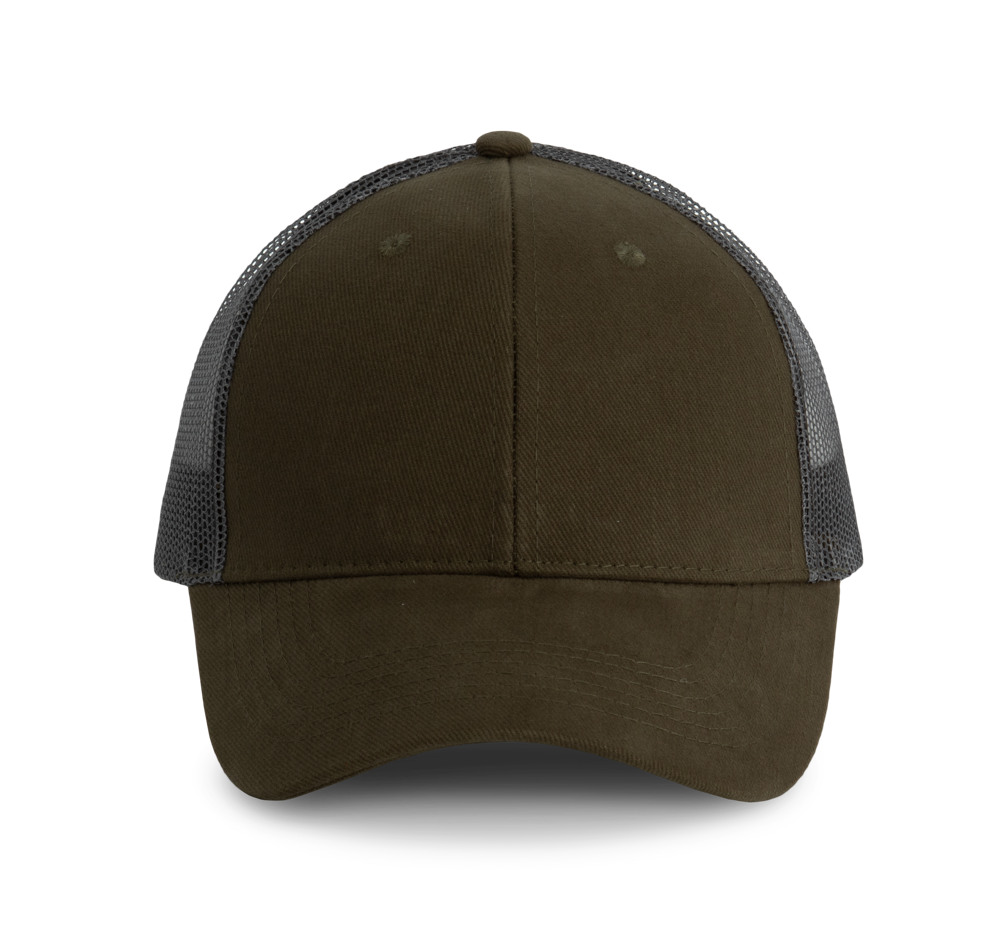 100% katoen / 100% polyester. Pet Trucker met 6 panelen.De voorste panelen en de afgeronde zonneklep zijn gemaakt van katoen, de mesh van polyester. Met een verstelbare druksluiting van plastic.