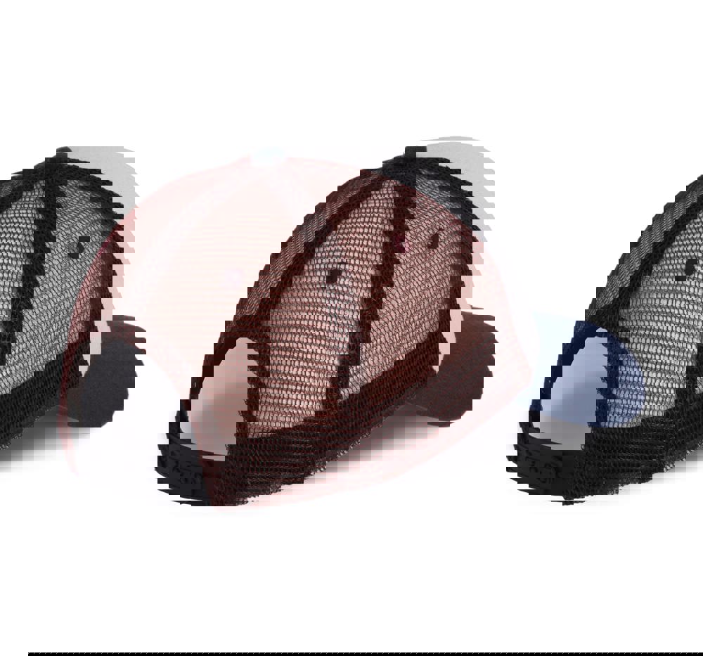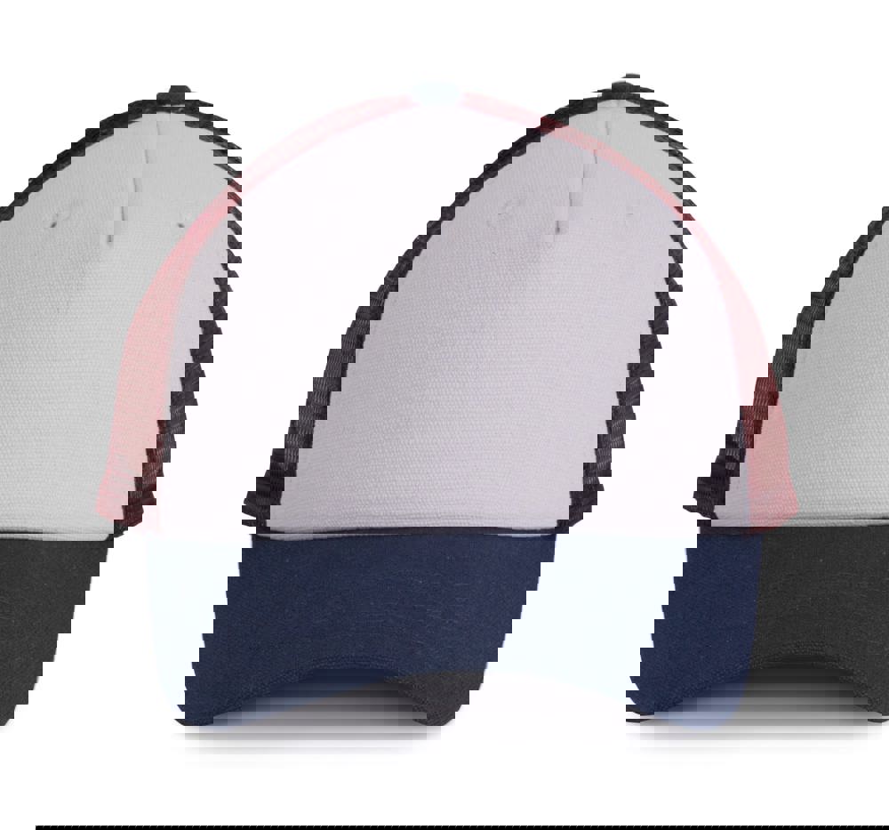 98% katoen / 2% polyester. Truckerpet met 5 panelen. Voorste panelen en zonneklep van canvaskatoen en mesh van polyester. Verstelbare druksluiting van plastic.