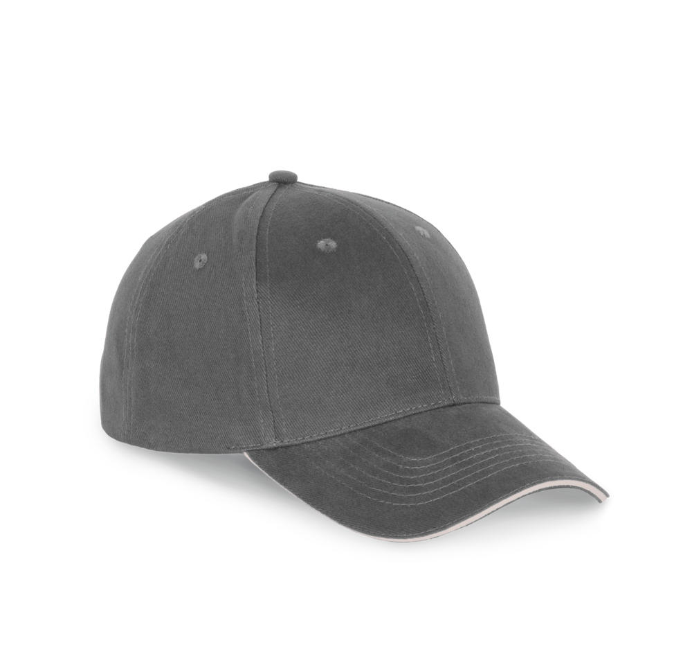 100% katoen. Pet met 6 panelen en contrasterende bies. Verstelbare sluiting met metalen gesp en zelfblokkerende lus.