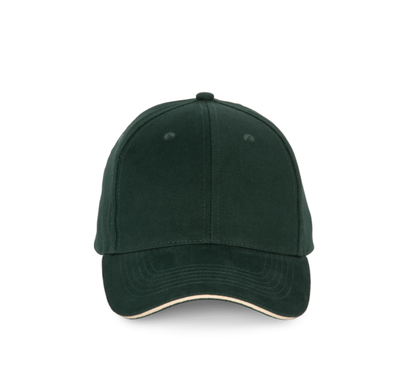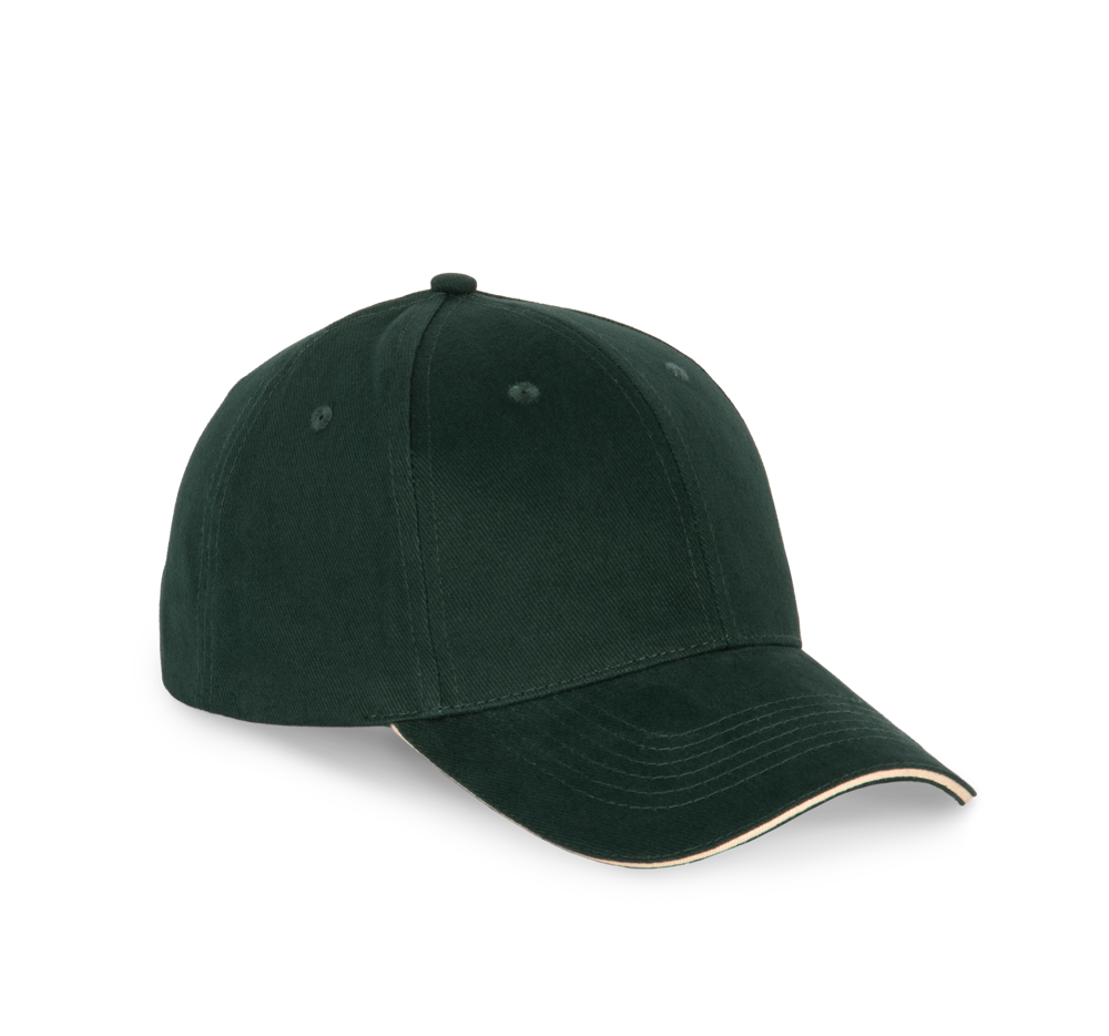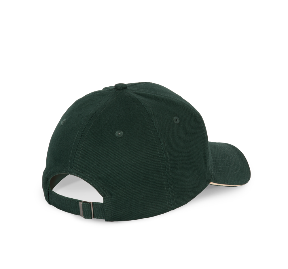 100% katoen. Pet met 6 panelen en contrasterende bies. Verstelbare sluiting met metalen gesp en zelfblokkerende lus.