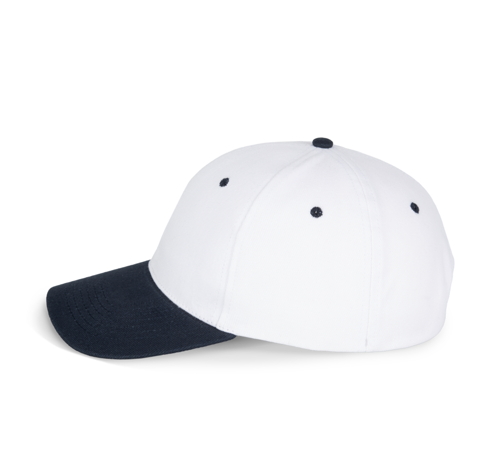 100% katoen. Pet 6 panelen. Verstelbare sluiting met metalen gesp en zelfblokkerende lus.