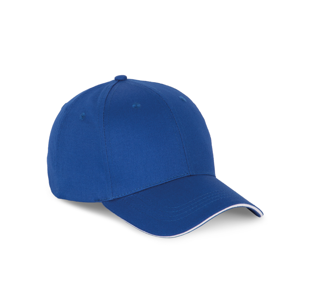 100% katoen. Pet met 6 panelen en contrasterende bies. Verstelbare sluiting met metalen gesp en zelfblokkerende lus.