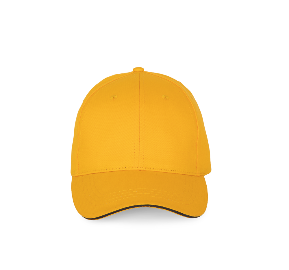 100% katoen. Pet met 6 panelen en contrasterende bies. Verstelbare sluiting met metalen gesp en zelfblokkerende lus.