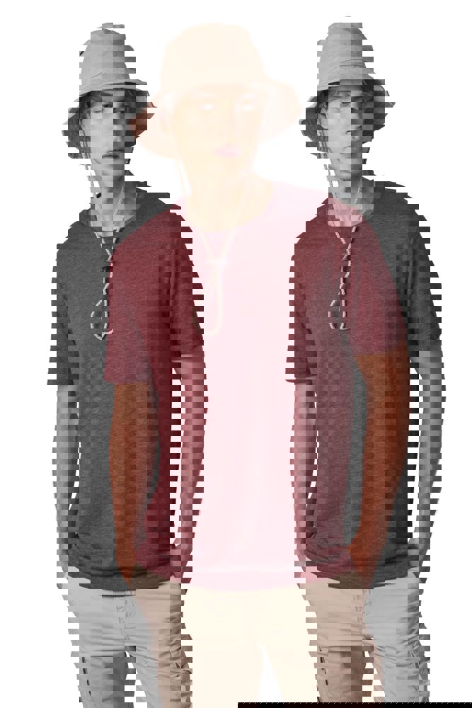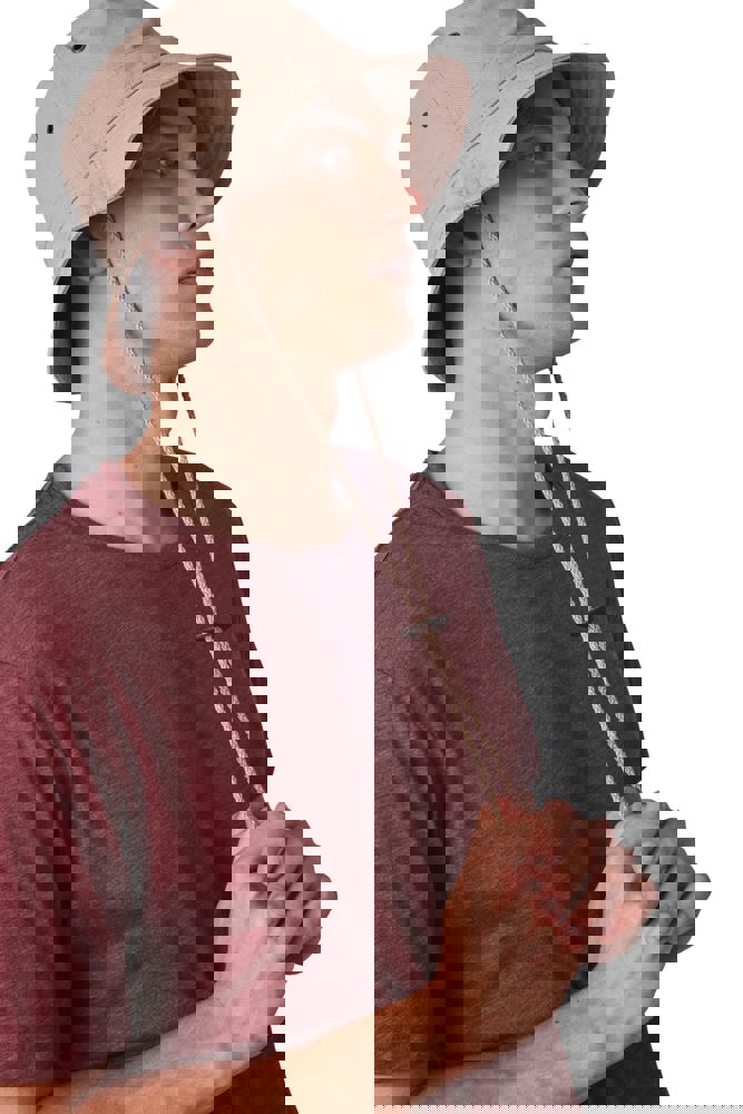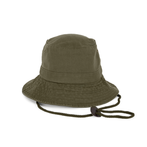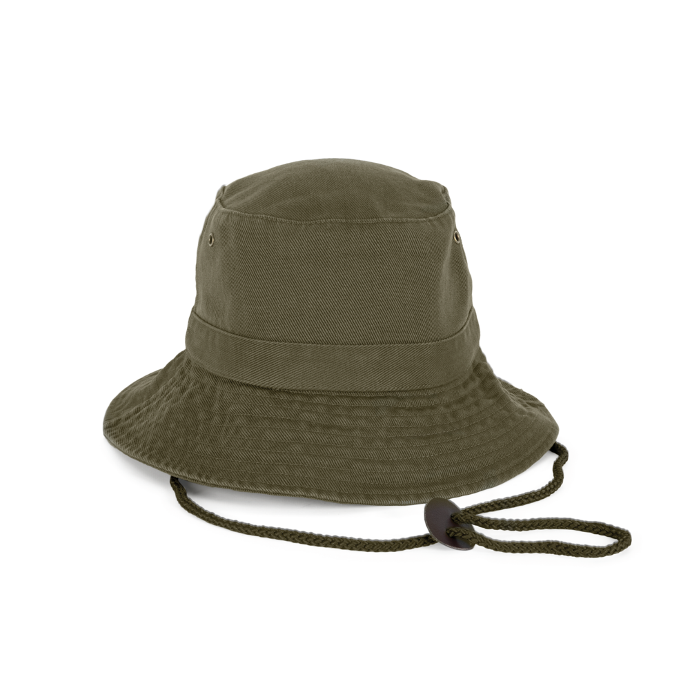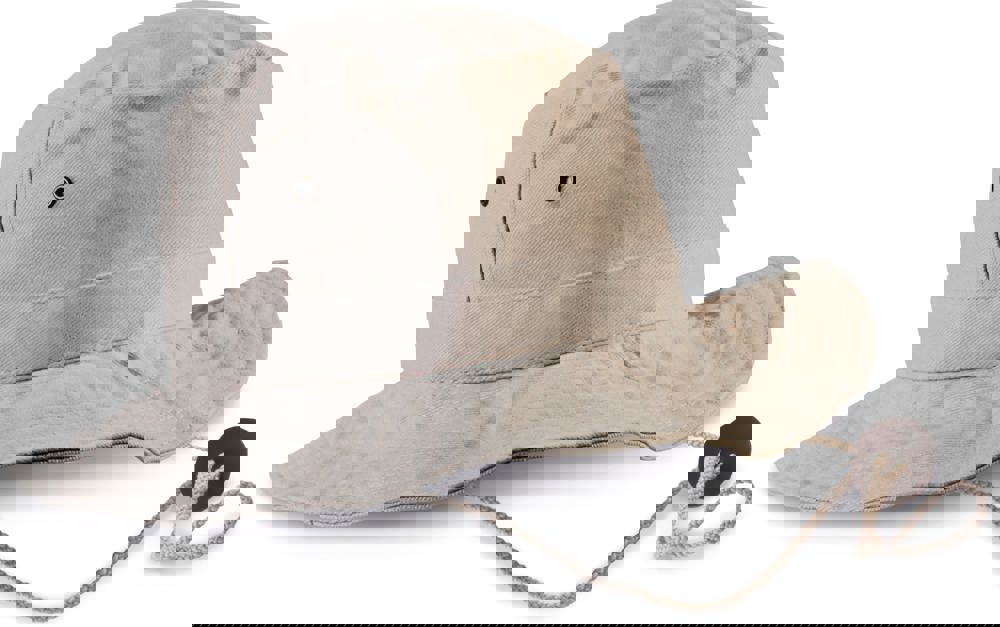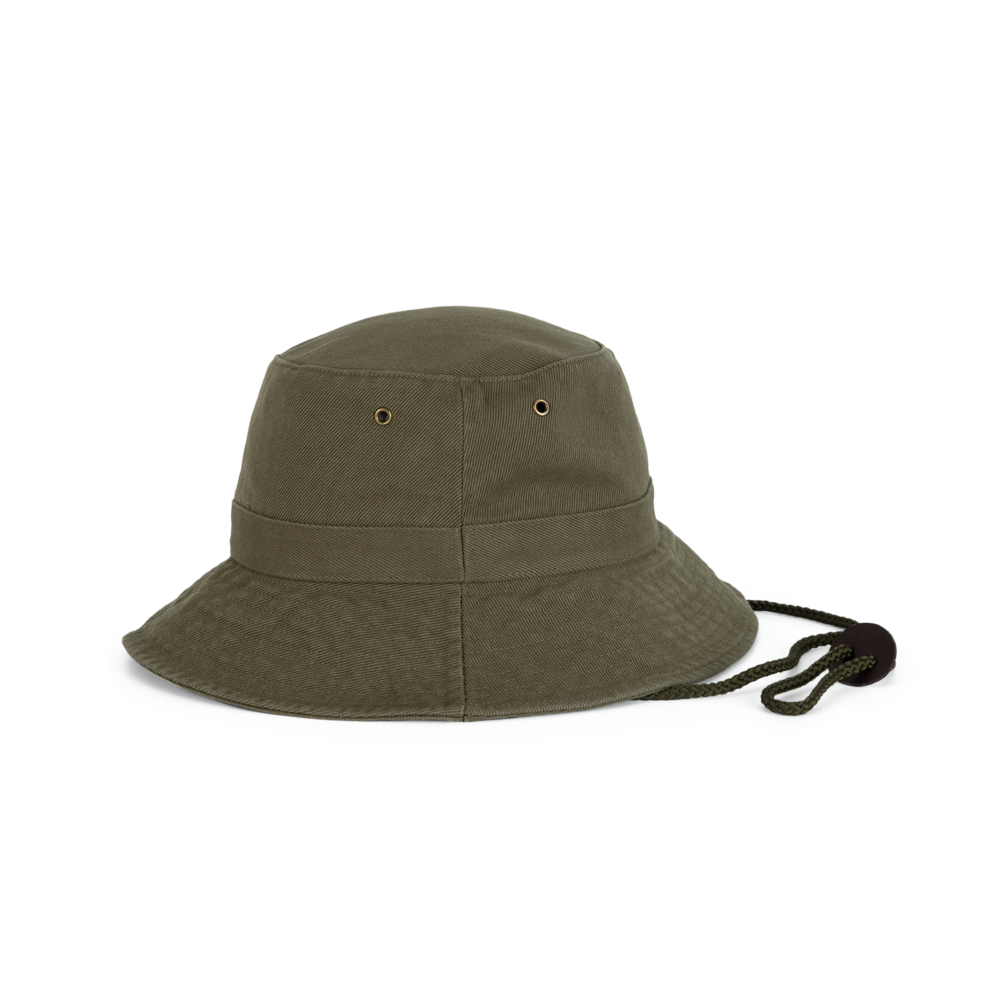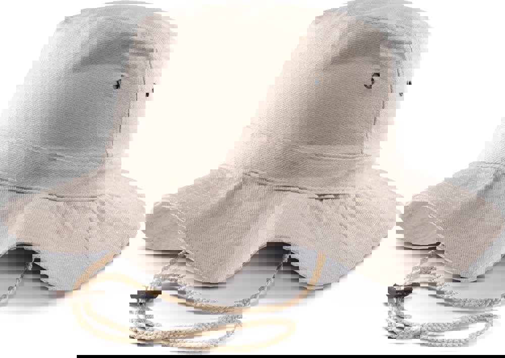 100% zwaar geborsteld katoen twill. Verstevigde rand afgewerkt met overstiksels. 4 metalen verluchtingsgaatjes. Verstelbaar aanrijgkoord met leren stopper.