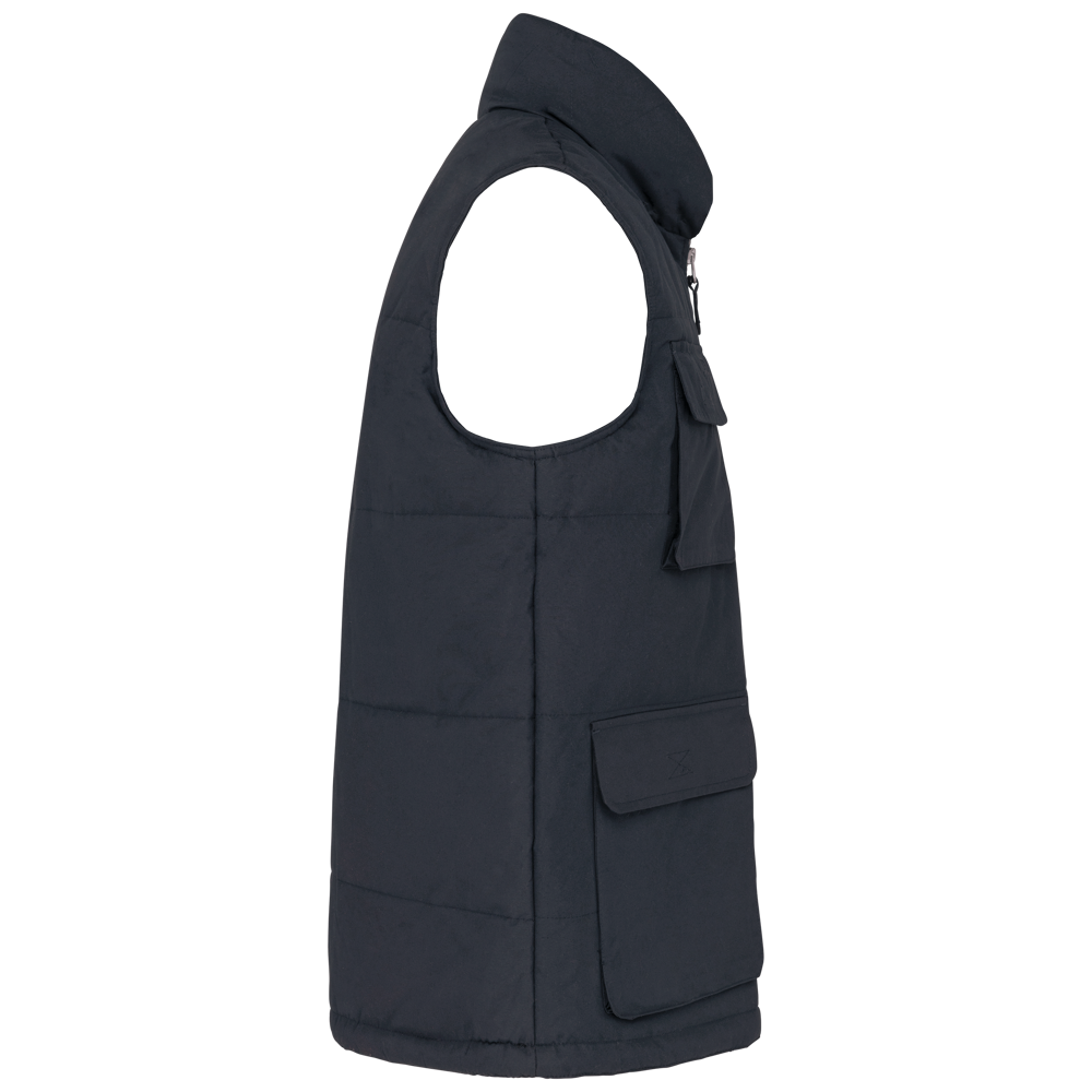 100% polyester. Microvezel PVC inductie 1500 mm waterdicht. Voering met 100% polyesterwatten. 4 voorzakken: 2 zakken aan de onderzijde met overslag en klittenbandsluiting, 1 borstzak+ gaatje voor draadje van de koptelefoon, en 1 borstzakje met ristsluiting. 1 binnenzak met rits. Gewatteerde kraag met ruimte voor het draadje van de koptelefoon. Aanrijgkoord aan de onderkant van de bodywarmer. Plastic zilverkleurige ritssluiting. Drukkersrits.