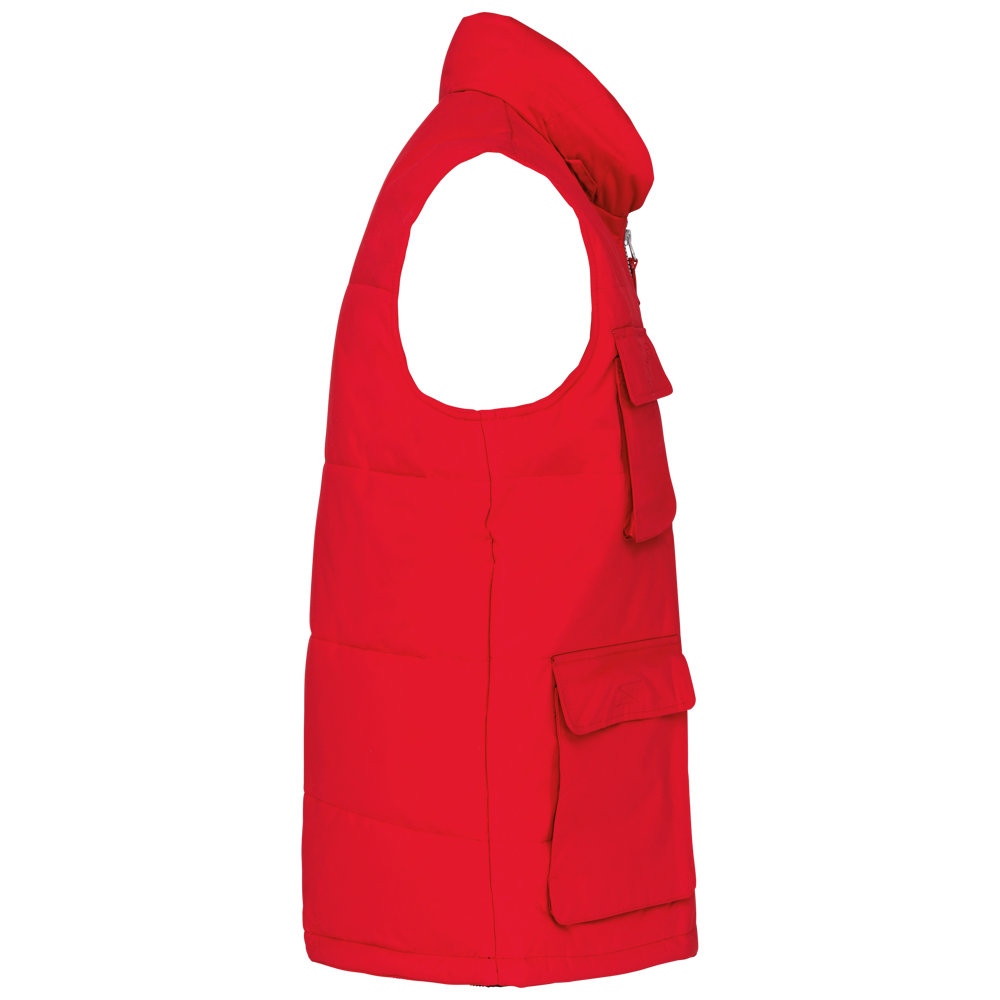 100% polyester. Microvezel PVC inductie 1500 mm waterdicht. Voering met 100% polyesterwatten. 4 voorzakken: 2 zakken aan de onderzijde met overslag en klittenbandsluiting, 1 borstzak+ gaatje voor draadje van de koptelefoon, en 1 borstzakje met ristsluiting. 1 binnenzak met rits. Gewatteerde kraag met ruimte voor het draadje van de koptelefoon. Aanrijgkoord aan de onderkant van de bodywarmer. Plastic zilverkleurige ritssluiting. Drukkersrits.