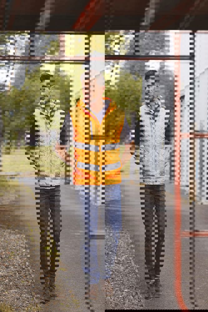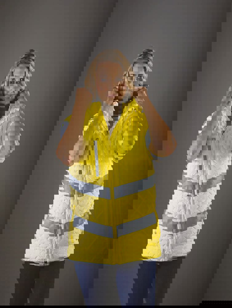 100% waterafstotend polyester, met fleecevoering en wattering in 100% polyester. 2 reflecterende v-vormige stroken (5 cm breed) op het lichaam, voor een betere zichtbaarheid. Opstaande kraag met ingewerkte kinbescherming. Borstzakje met rits. 2 handverwarmende ritszakken opzij. 1 opgenaaide zak in de vaste fleecevoering. Reflecterende bies onderaan het kledingstuk. Blinde drukkersrits onderaan het kledingstuk (binnenkant). Conform aan de norm EN ISO 20471:2013 van klasse 2 (enkel kleuren Hi-Vis Yellow en Hi-Vis Orange) en aan de norm inzake signalisatiekledij van de spoorwegen UK GO/RT 3279 Issue 8:2013 (enkel Hi-Vis Orange).