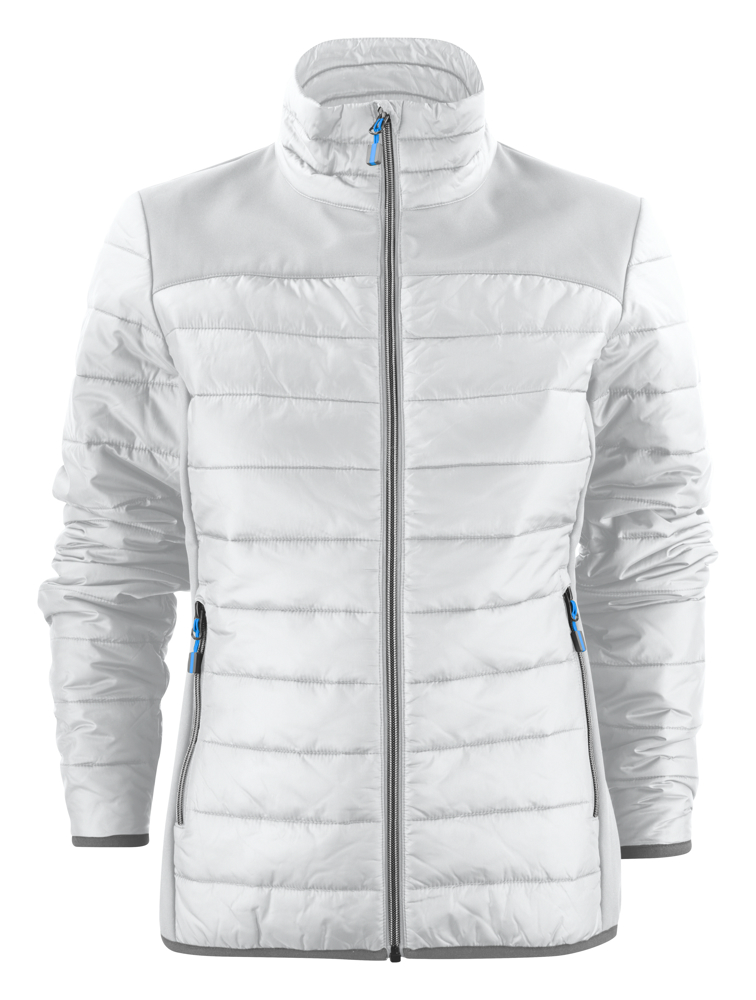Lichte jas in twee materialen: juk en zijpanelen in softshell en body (voor-en achterzijde) en mouwen in lichtgewatteerd taffeta materiaal. Contrasterende ritssluiting. De zippullers kunnen indien gewenst vervangen worden door één van de andere beschikbare kleuren.