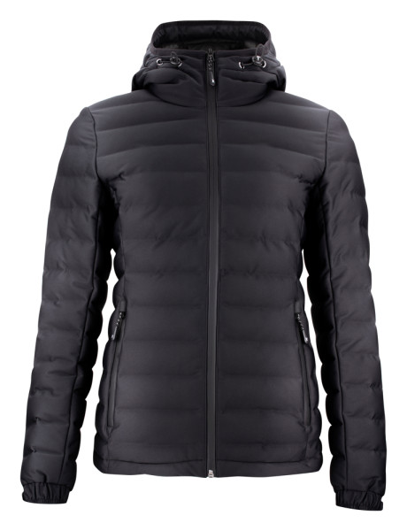 Gewatteerde winterjas. Waterdichte ritssluiting vooraan en aan de zijzakken. De zijzakken zijn aan de binnenkant afgewerkt samen met de zoom zodat deze als binnenzakken gebruikt kunnen worden. Aanpasbare drukknoopsluiting aan de manchetten. Aanpasbare capuchon met elastische trekkoorden aan de zijkanten, afgewerkt met een elastische bies aan de zoom.