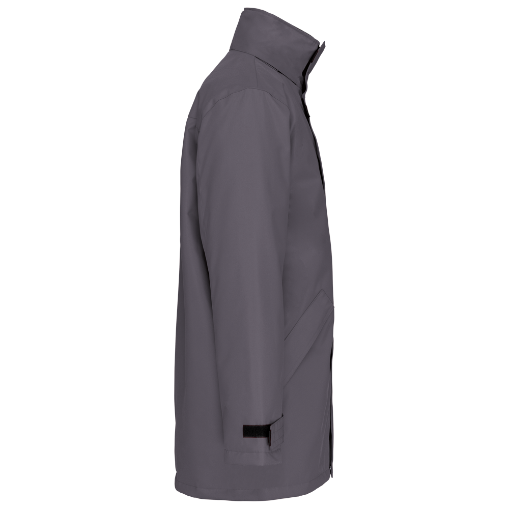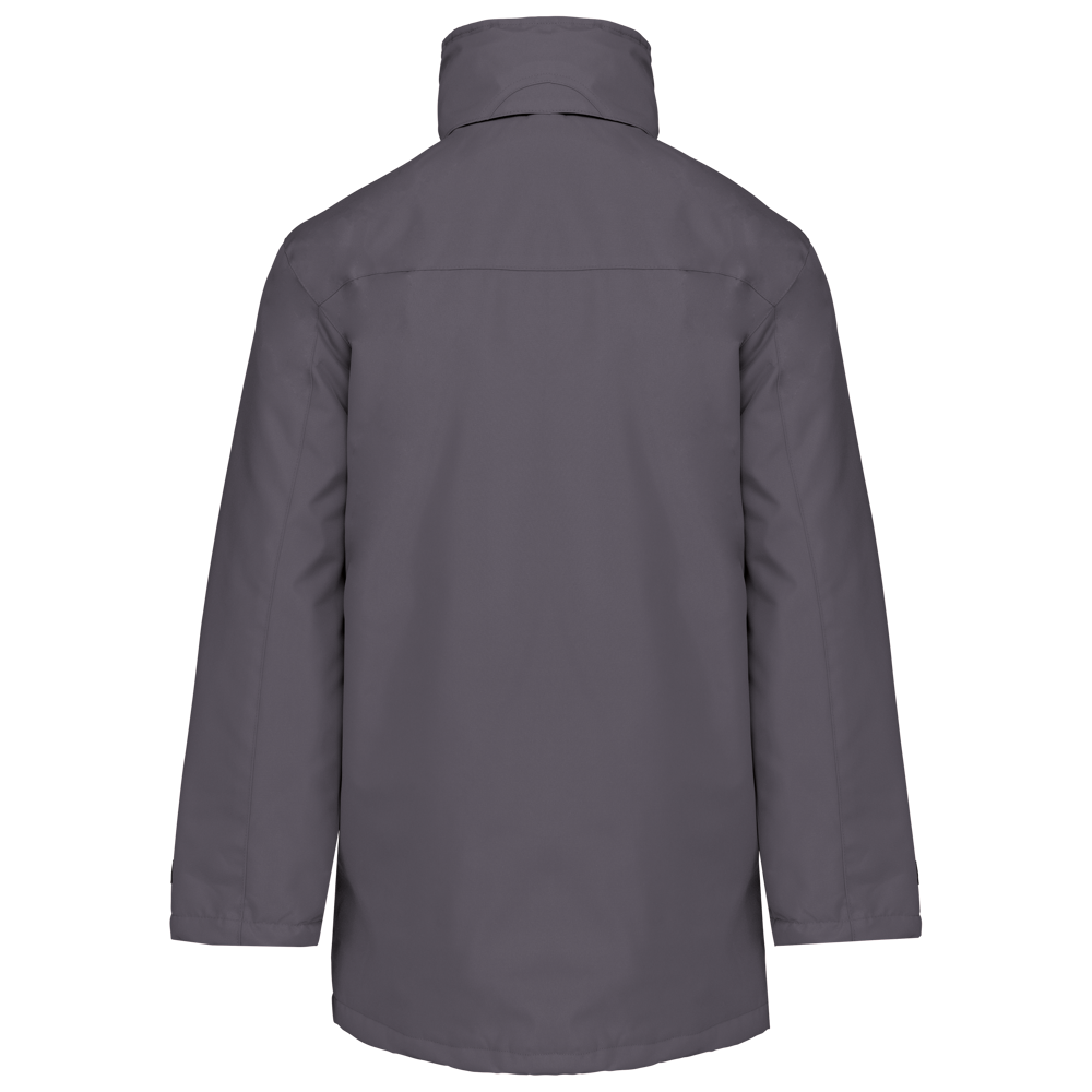 Buitenkant: 100% oxford polyester. Binnenkant: gewatteerd polyester. 2 voorzakken met rits. 2 binnenzakken waarvan 1 voor de GSM. Capuchon verborgen in de kraag. Kraag met fleecevoering. Drukkersrits. Ritssluiting verborgen onder een lijst met drukknopen en klittenband. Verstelbare mouwuiteinden met klittenband.