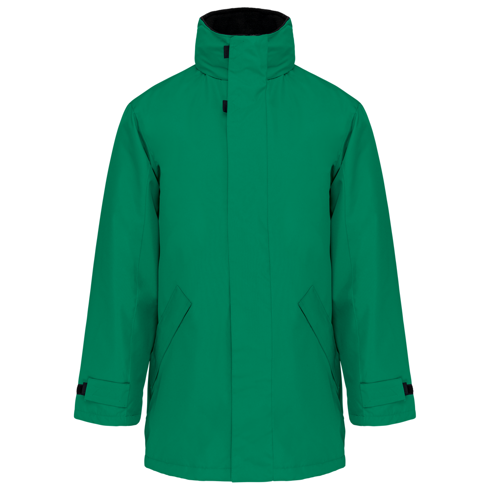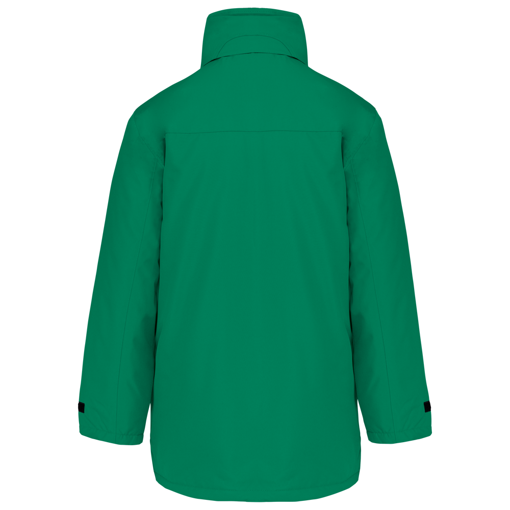 Buitenkant: 100% oxford polyester. Binnenkant: gewatteerd polyester. 2 voorzakken met rits. 2 binnenzakken waarvan 1 voor de GSM. Capuchon verborgen in de kraag. Kraag met fleecevoering. Drukkersrits. Ritssluiting verborgen onder een lijst met drukknopen en klittenband. Verstelbare mouwuiteinden met klittenband.