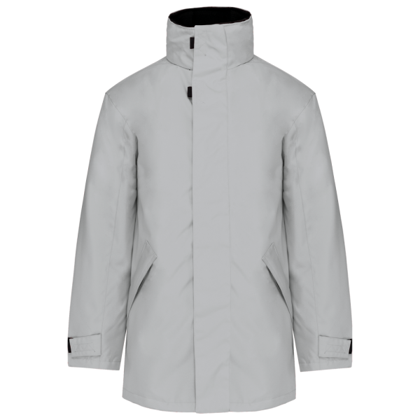 Buitenkant: 100% oxford polyester. Binnenkant: gewatteerd polyester. 2 voorzakken met rits. 2 binnenzakken waarvan 1 voor de GSM. Capuchon verborgen in de kraag. Kraag met fleecevoering. Drukkersrits. Ritssluiting verborgen onder een lijst met drukknopen en klittenband. Verstelbare mouwuiteinden met klittenband.