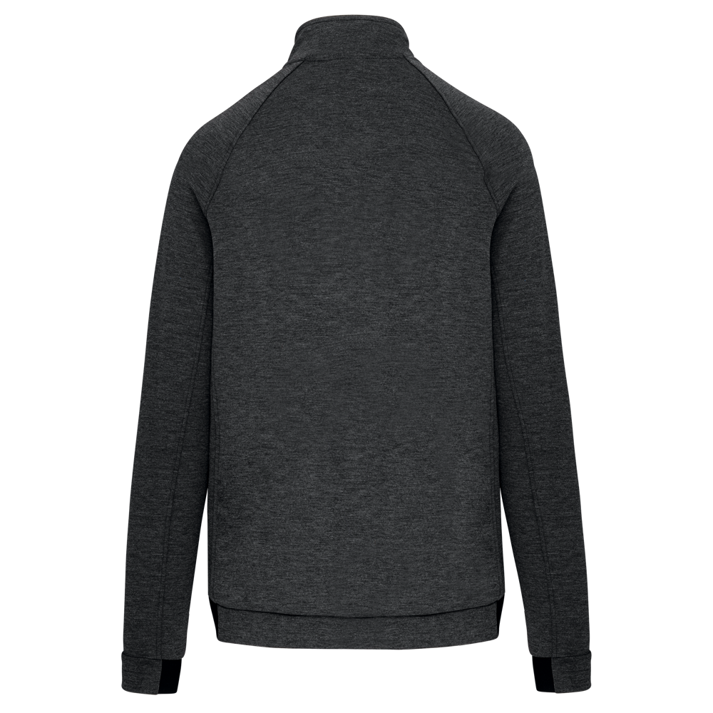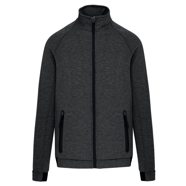 94% polyester / 6% elasthan (79% polyester / 15% viscose / 6% elasthan voor Heather kleur). Hele comfortabele stof. Ritssluiting. 2 ritszakken met warmtegelaste afwerking aan de voorkant. Nauwsluitende boorden aan de mouwen en onderaan, met een elastisch stuk Black op alle kleuren en Dark Grey op de Ash Heather (sluitingen ook). Ideaal om te dragen op trainingsbroek PA1008 in een total Urban Apparel stijl.