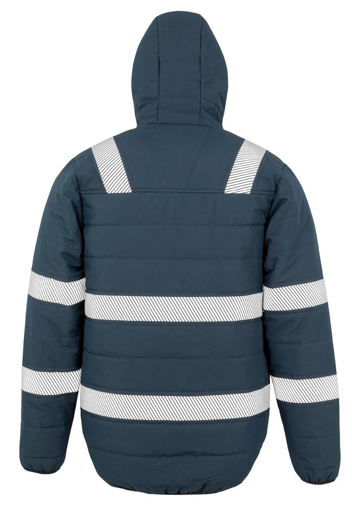 100% polyester. 100% gerecycled polyester. Gerecyclede gewatteerde ripstop veiligheidsjas. Bestand tegen schuren met REPREVE®. Vulling van gerecycled polyester 200 g/m² REPREVE®. Vezels gemaakt van gerecyclede petflessen. YKK-ritssluiting aan de voorkant met kinbescherming en schuiver. Tailleband, mouwuiteinden en capuchon met elastische bies. Langer achterpand. Gedrukte reflecterende stroken op het lichaam, de schouders en de mouwen. Zijzakken met rits. Gewatteerde capuchon. Binnenzak. Ophanglus. Norm High Viz: EN ISO 20471: 2013+A1: 2016 Klasse 2 (RIS-3279-TOM Klasse 2 (enkel oranje model)).