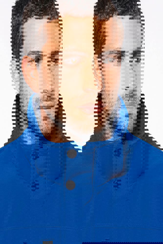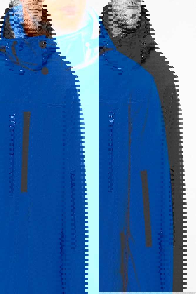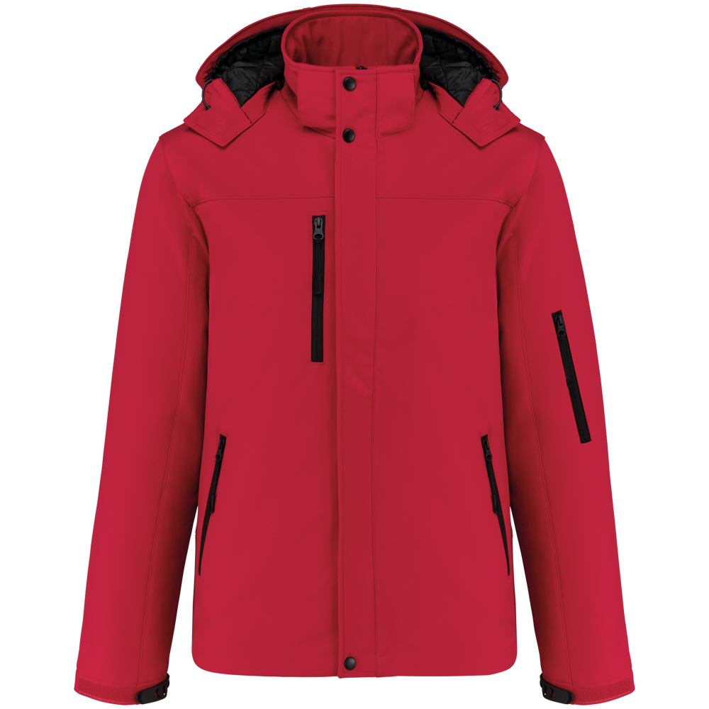95% polyester / 5% elasthan. 3-laagse ademende stof 3000 g/m²/24 u en waterdicht 8000 mm. Buitenkant: 95% polyester / 5% elasthan. Tussenlaag: ademend membraan. Binnenlaag: microfleece. Gewatteerde voering van 100% polyester. Voorkant: 4 ritszakken (2 aan de zijkant, 1 op de mouw, 1 rechts op de borst). 2 binnenzakken met drukknoop. Afneembare capuchon met 3 gevoerde en gewatteerde panelen, regelbaar met stoppers. Met klittenband regelbare mouwuiteinden. 1 rits aan de linkerkant en 1 drukkersrits.