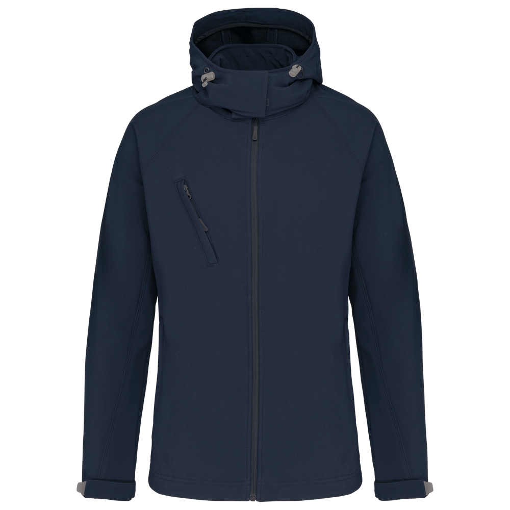 Stof in 3 lagen op elkaar geklit. Ademend 1000 g/m²/24h en 5000 mm waterdicht. Buitenkant : 95% polyester en 5% elasthan. Tussenlaag: ademend ventilerend membraan. Binnenkant: anti-pluis polyester. Raglan mouwen. Ritssluiting. 2 voorzakken met rits. 1 borstzak rechts met rits. Afneembare capuchon met aanrijgkoord en klittenbandsluiting. Klittenbandsluiting aan de mouwuiteinden. Verborgen drukkersrits op borsthoogte.