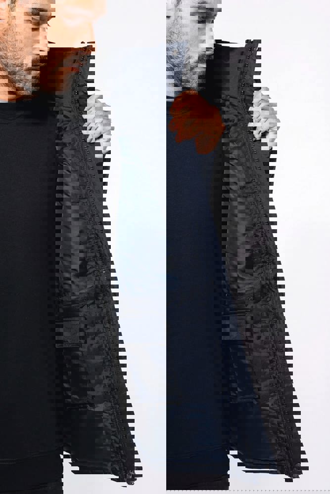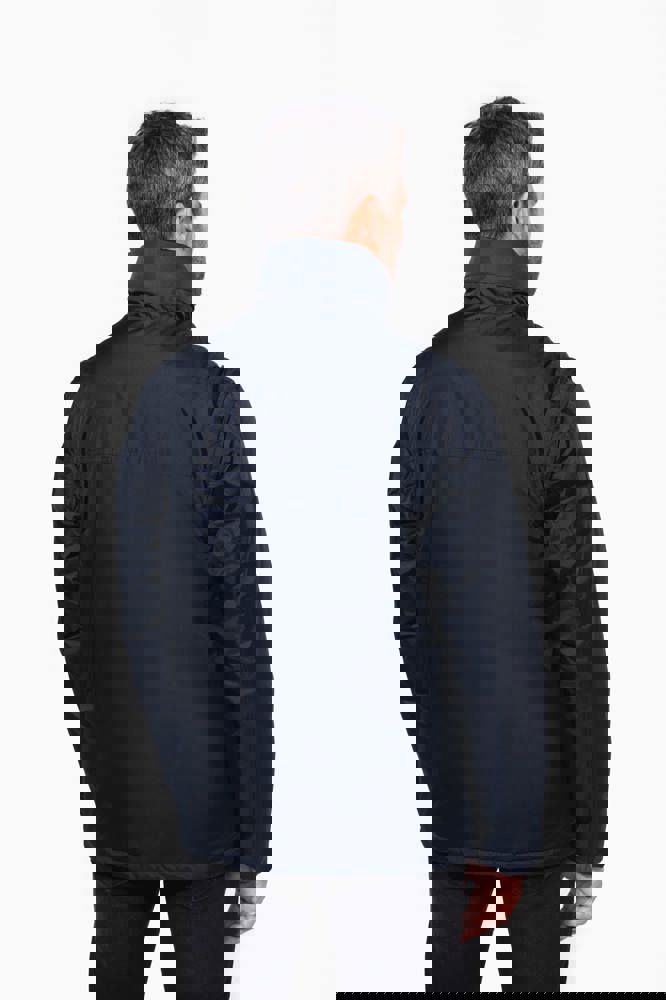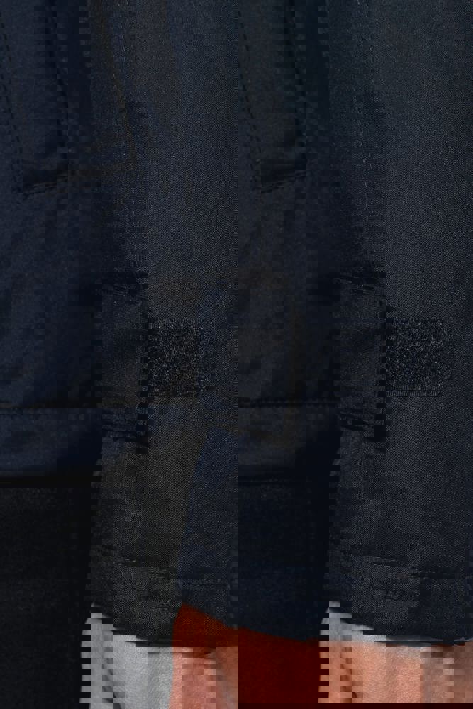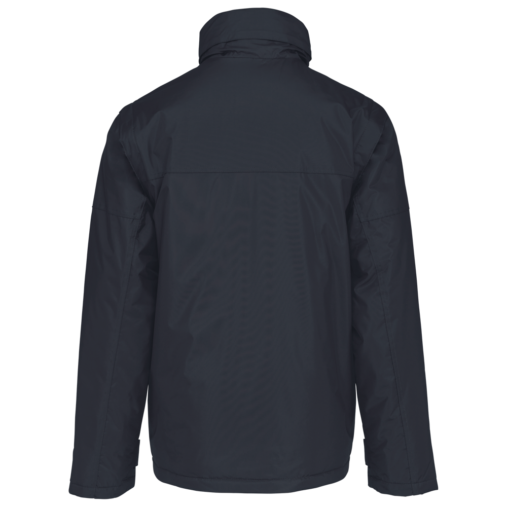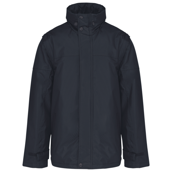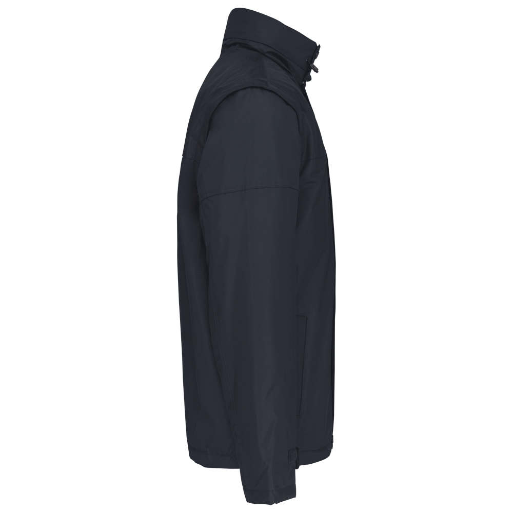 Buitenkant 100% polyester met PVC coating. Binnenvoering 100% polyester gewatteerd. Ritssluiting verborgen onder een lijst van drukknopen. Afritsbare mouwen. Met klittenband verstelbare mouwuiteinden. 2 voorzaken en 1 binnenzak voor GSM. Capuchon met ritssluiting en aanrijgkoord aan de kraag. Aanrijgkoord onderaan met stopper. Drukkersrits.