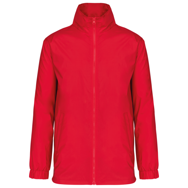 100% polyamide 210 T met acryl inductie. Grijze binnenvoering van 100% polyester single jersey. Ritssluiting. 1 binnenzak en 2 buitenzakken. Aanrijgkoord met stoppers onderaan. Capuchon in de kraag met elastisch koord. Drukkersrits.