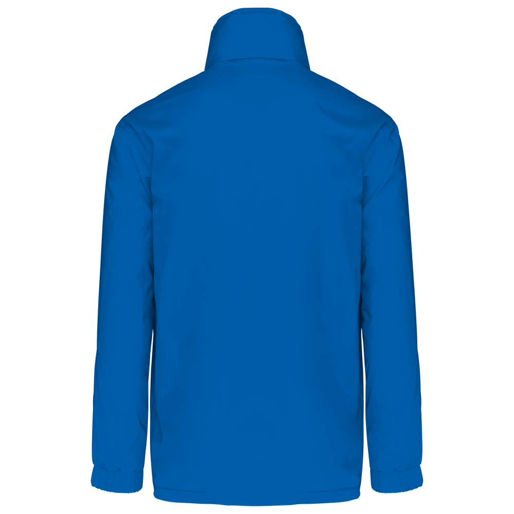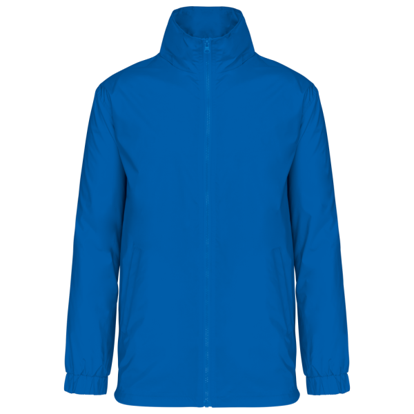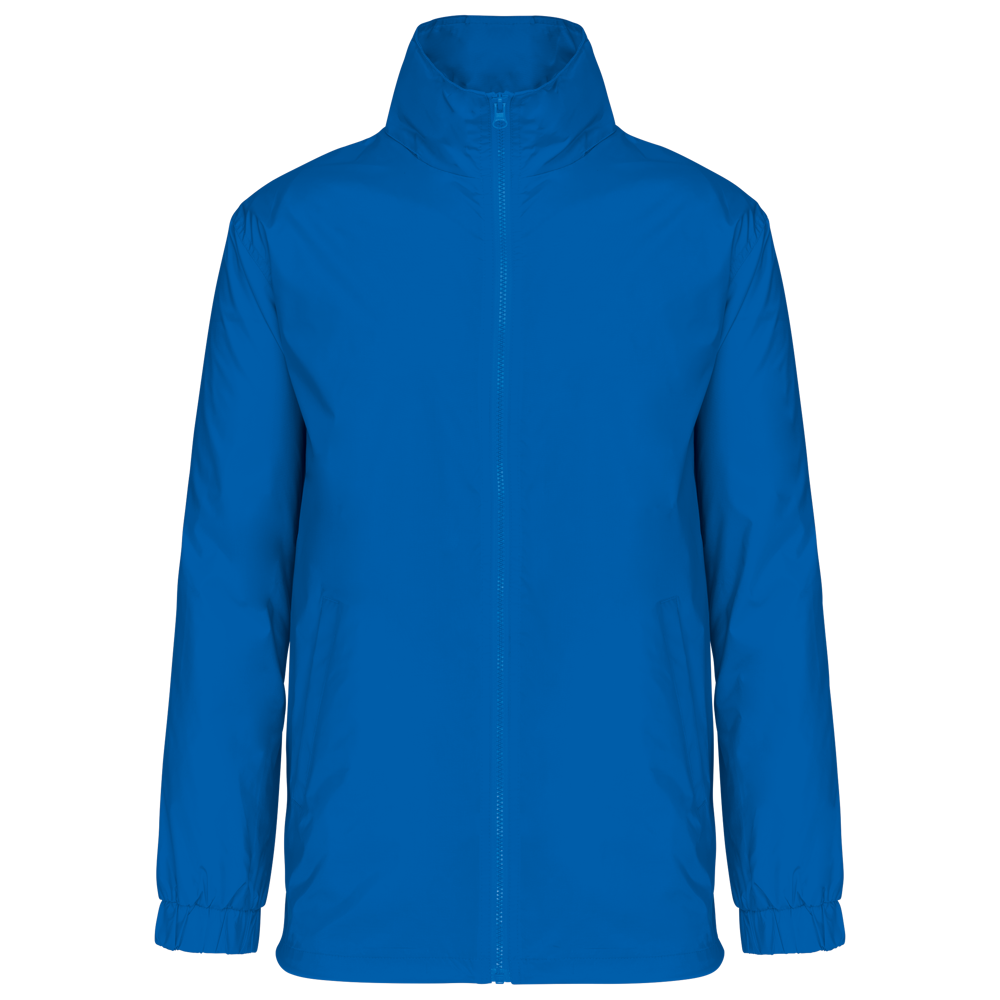 100% polyamide 210 T met acryl inductie. Grijze binnenvoering van 100% polyester single jersey. Ritssluiting. 1 binnenzak en 2 buitenzakken. Aanrijgkoord met stoppers onderaan. Capuchon in de kraag met elastisch koord. Drukkersrits.