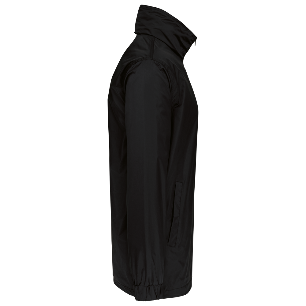 100% polyamide 210 T met acryl inductie. Grijze binnenvoering van 100% polyester single jersey. Ritssluiting. 1 binnenzak en 2 buitenzakken. Aanrijgkoord met stoppers onderaan. Capuchon in de kraag met elastisch koord. Drukkersrits.
