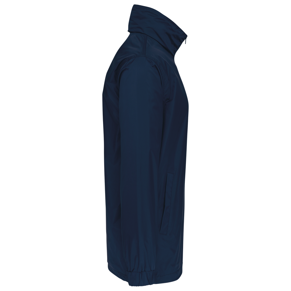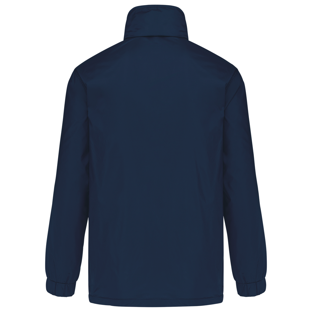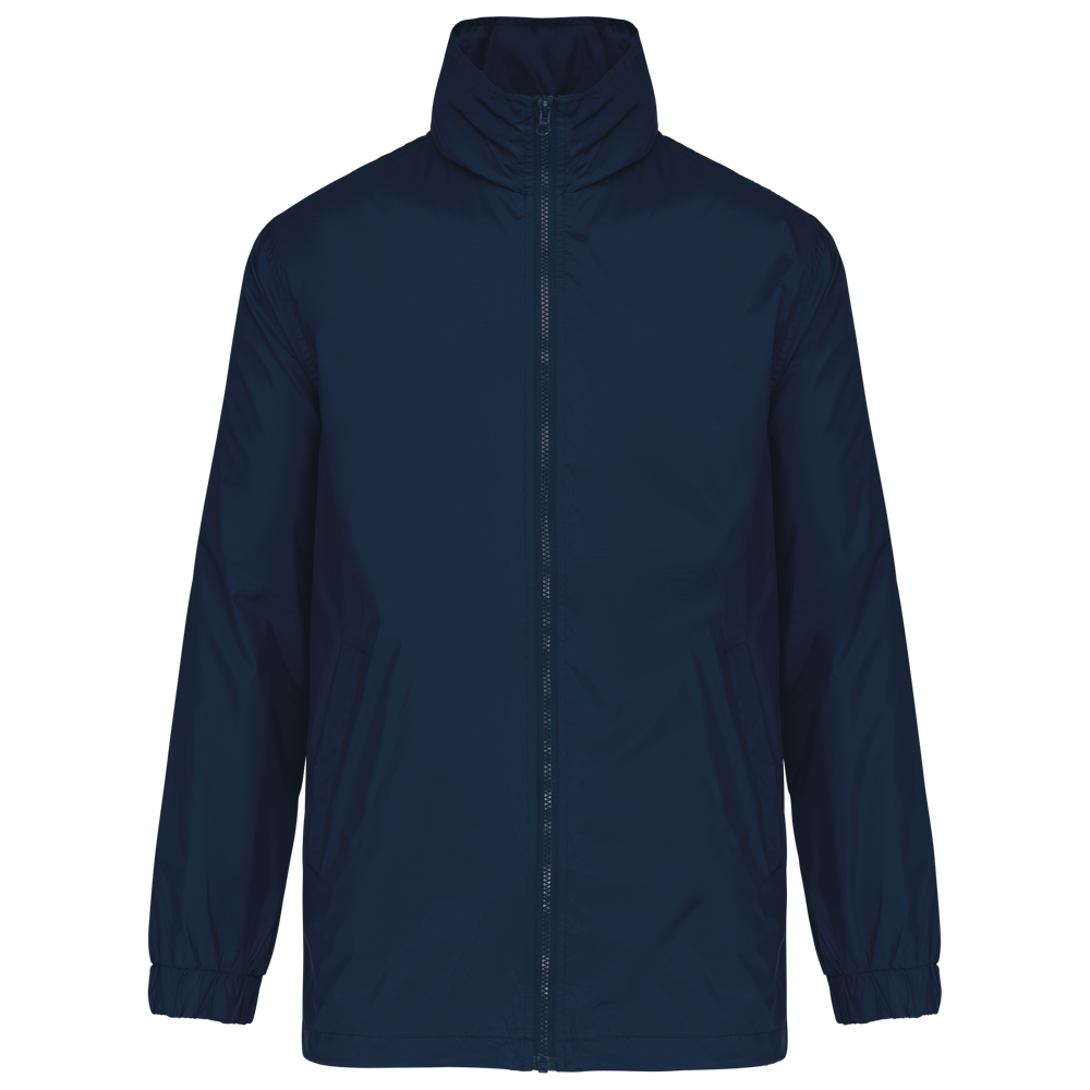 100% polyamide 210 T met acryl inductie. Grijze binnenvoering van 100% polyester single jersey. Ritssluiting. 1 binnenzak en 2 buitenzakken. Aanrijgkoord met stoppers onderaan. Capuchon in de kraag met elastisch koord. Drukkersrits.